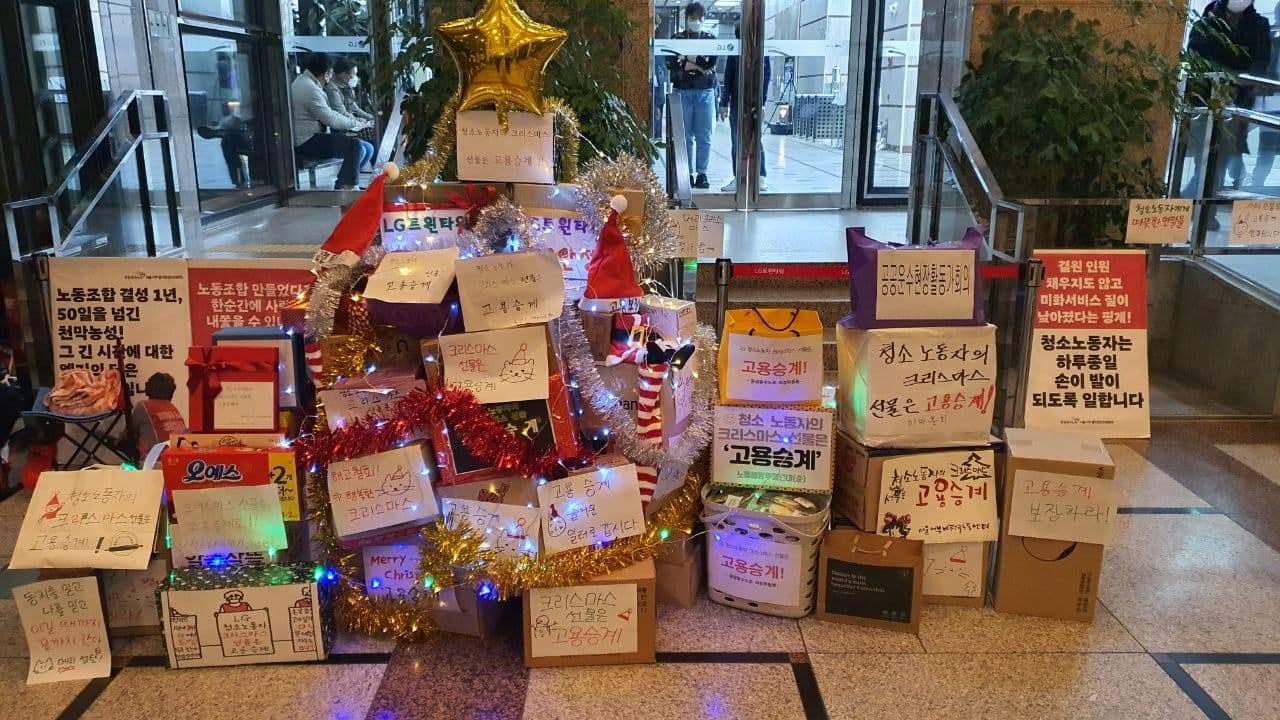 “근무하는 직원들도 말은 못 하지 자기네 밥줄이니까. 근데도 소리 없이 응원하는 사람들 많아요. 은근히 밥값도 넣어주고 손편지도 써서 주고. 지나가다가 힘내라고 이렇게 하고. (중략) 될 수 있으면 똘똘 뭉쳐서 우리 같이해보자. 지금도 힘들고 하 이게 될까 막 그만둘까 이런 마음이 있는 사람들도 있어 사실 나조차도 그렇고. 그럼에도 불구하고 여기까지 왔는데 우리를 바라보는 사람이 얼마나 많은데. 이 큰 엘지를 이기지 못한다면 주변에 있는 건물들에 있는 청소노동자들이나 경비나 보안들, 이런 사람들도 은근히 우리를 바라보고 있거든 그래서 우리는 꼭 이겨야 하고. 지금 연대해주시는 분들 또 지부에서 민주노총 지부에서 엄청 애쓰고 있잖아. 그분들의 수고도 헛되면 안 되고 우리는 여기서 그냥 해고당했으니까 너무 억울하잖아.”
