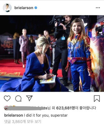 브리 라슨은 마블의 명예 회장 스탠 리의 죽음에 대해 SNS에 추모글을 남기며 불량한 포즈의 사진을 사용했다는 논란(?)에 휩싸인 바 있다. 그래서 많은 이들이 브리 라슨이 캡틴 마블 역할을 하기로 한 것에 대해 의아해하기도 했다. 하지만 우리는 이 글을 통해 그가 어떤 생각으로 <캡틴 마블> 촬영에 임했는지 짐작할 수 있다. 어른 여성인 그가 자신과 같은 옷을 입은 어린 여성과 눈높이를 맞춰 앉아있는 이 모습은 묘한 울림을 준다. 사실 어른과 아이를 나누는 경계는 애매하다. 하지만 누군가를 보고 ‘배우는’ 위치보다 누군가에게 나의 모습을 ‘보여주는’ 위치에 가까워질수록 어른에 그리고 책임에도 가까워지는 게 아닐까. 그런 의미에서 우리는 모두 나보다 어린 여자아이들에게, 내가 무엇을 보여주는지에 대한 책임이 있는지도 모른다.