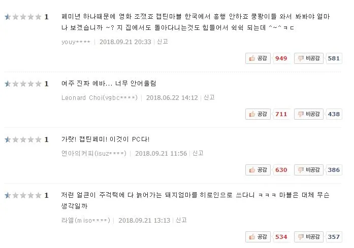 비슷한 반응을 <캡틴 마블> 제작 소식에서도 볼 수 있었다. 마블의 첫 여성 히어로 솔로 무비인 <캡틴 마블>은 개봉 전부터 ‘캡틴 메갈’이라는 조롱과 함께 평점 테러에 시달렸다. 네티즌 관람평에서는 ‘마블에도 페미(니즘) 묻었네’ 와 같은 발언을 질리도록 볼 수 있었다.