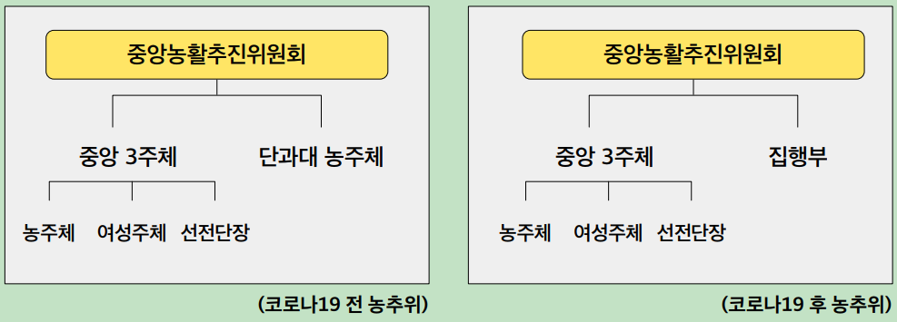 농활을 기획하고 진행하는 중앙농활추진위원회(농추위)는 코로나19 전후로 구성이 다르다. 코로나19 전에는 중앙 3주체와 각 단과대 농주체로 구성되었는데, 후에는 중앙 3주체와 집행부로 구성되었다.