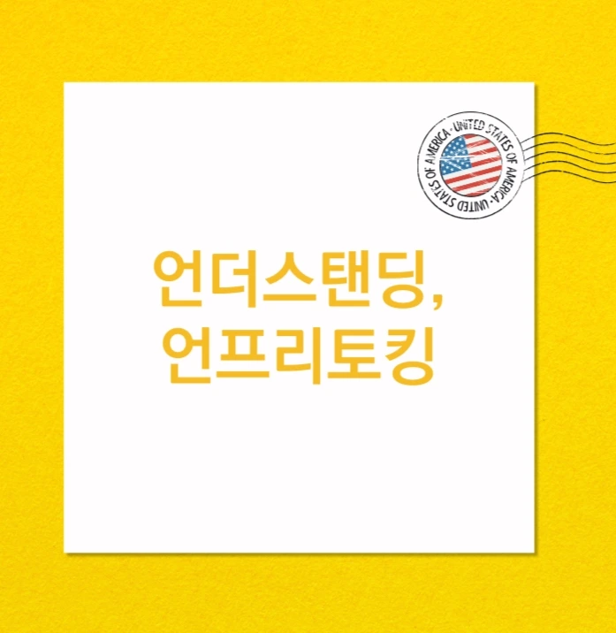 노란 테두리, 가운데 흰색. 오른쪽 위에는 미국 국기가 그려져 있고, 가운데에는 '언더스탠딩, 언프리토킹'이라 적혀있다.