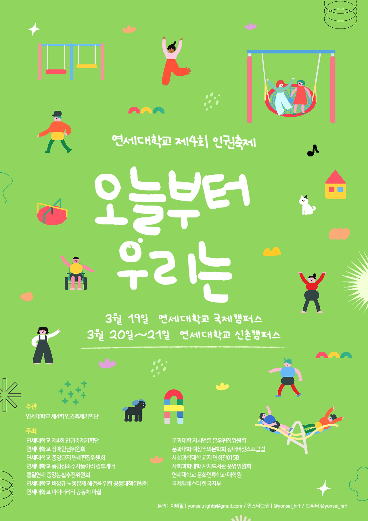 그러나 ‘다른 삶’은 언제나 지금 그리고 여기 있습니다. 취약함을 혼자 감내하는 대신, 서로가 서로를 보살필 사회의 모양새를 제시하는 이들이 있습니다. 제4회 연세대학교 인권축제는 시대와 불화하는 이들을 백양로 위로 초대합니다. 대체로 ‘비정상’이고, 어쩌면 더러우며, 때때로 지나치게 소란한 다양한 ‘오늘’들의 이야기를 쏟아내 대학에 대한 우리의 감각을 질문합니다. 그럼으로써 결코 도달할 수 없는 좋은 삶의 환상과 그로 인한 막연한 두려움을 해체하고자 합니다. 한 사람의 취약성이 모든 이가 함께하는 상호의존의 정치로 발돋움할 때, 삶이 어떻게 변화할 수 있는지 들여다보고자 합니다.”