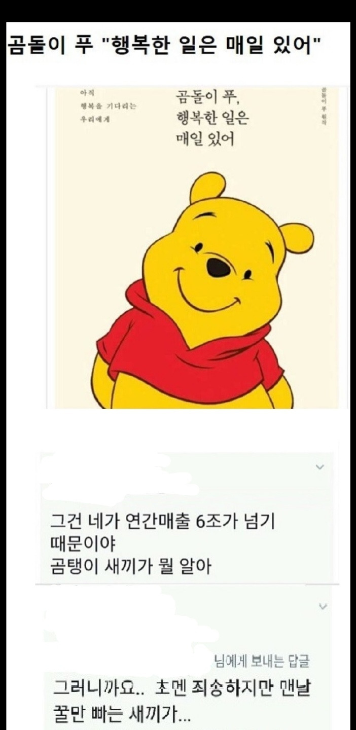 그러나 사회가 나에게 위로를 건넬 때는 그만큼의 효과가 없다. 오히려 역효과를 내기도 한다. 위로의 내용을 담은 책들은 공통점이 있는데 다양한 표현을 가진 위로의 말이 담겨 있다는 것이다. 이는 “이 중 하나는 걸리겠지”의 생각을 쓴 듯하다. 가족이나 친구와 달리 작가는 독자 개개인에게 집중하여 그들의 문제를 들여다볼 수 없다. 특히 최근에 나온 ‘행복한 일은 매일 있다는’ 곰돌이와 ‘나의 곁에 있어 달라는’ 갈기 없는 사자의 책 같은 경우는 그럴 필요성을 느끼지도 않는다. 독자 한 명이 처한 상황의 개별성, 특수성을 고려하지 않는다. 구체적인 상황 속에서 깊이 고민하고 건네는 위로가 아니라 추상적이고 흔히들 하는 어디에나 맞을 이야기를 늘어놓아 하나 마나 한 그럴싸한 따뜻한 문장들로 ‘해결’하려 한다. ‘당신은 문제가 있고, 그 문제는 얼른 해결해야 하니 이런 이쁜 문장을 주겠다, 얼른 감정을 처리해버려라’ 하는 것 같다. 감성을 자극한다면 그것으로 충분하다.