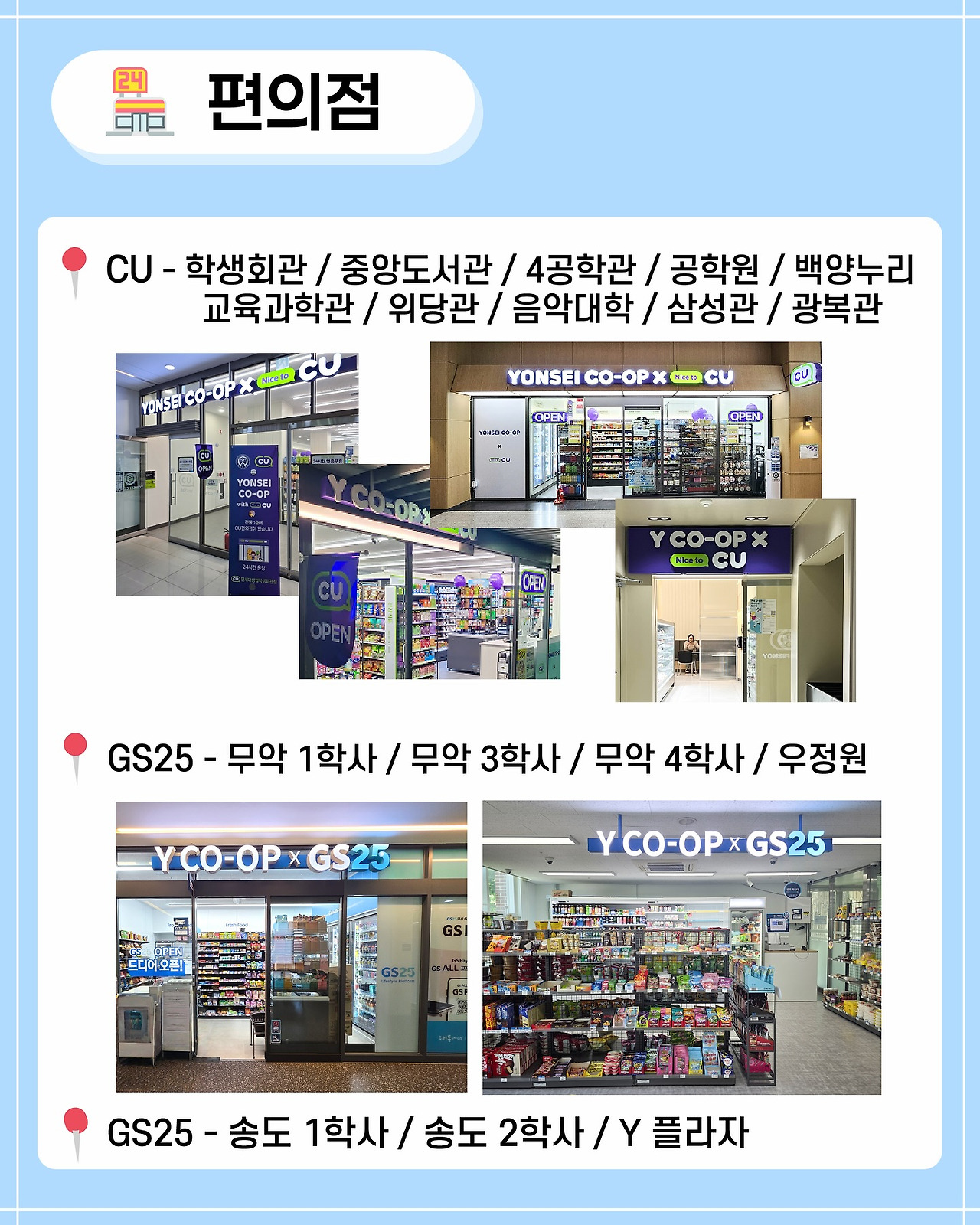 [4] 신촌캠퍼스 생협 직영매점은 CU와의 협업을 통해, 국제캠퍼스 직영매점은 GS25와의 협업을 통해 새단장했다.