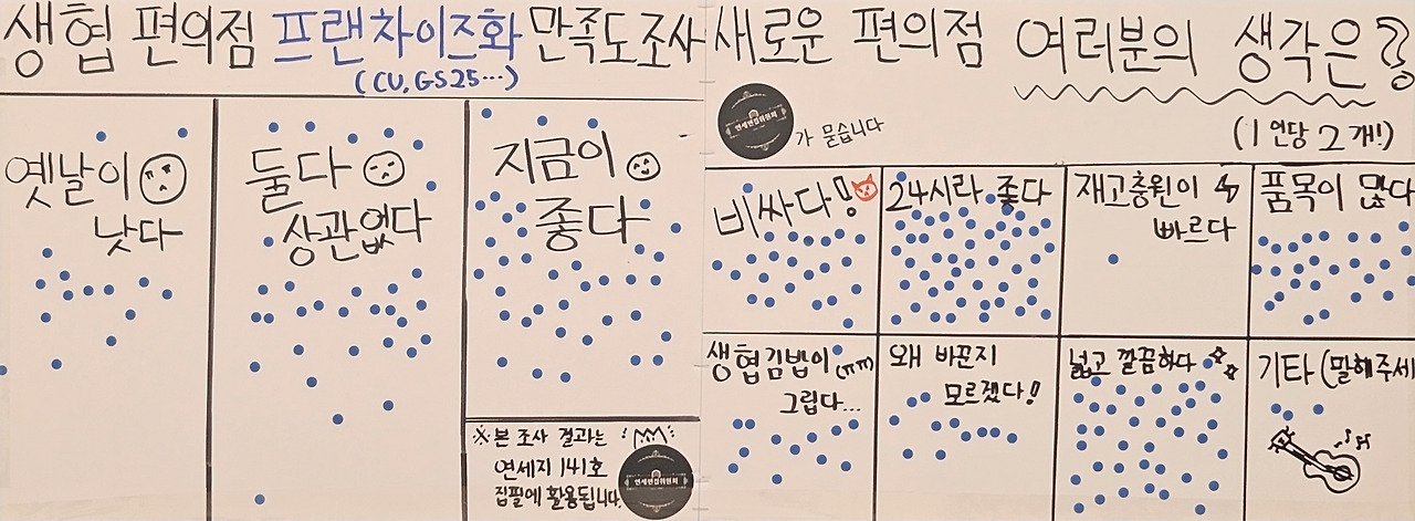 한편 원론적으로 생협은 학생-조합원들의 출자금으로 이루어진 협동조합이니 그들의 의견이 가장 중시되어야 한다. 생협 직원들의 말에 따르면 학생들은 직영 매점보다 프랜차이즈를 더욱 선호했다는데, 정말 사실일까? 그것을 알아보기 위해 필자들은 판넬을 들었다. 11월 18일 12시부터 2시까지 2시간동안 학생회관 앞을 지나다니는 연세대학교 구성원들을 대상으로 스티커 설문조사를 진행했다.