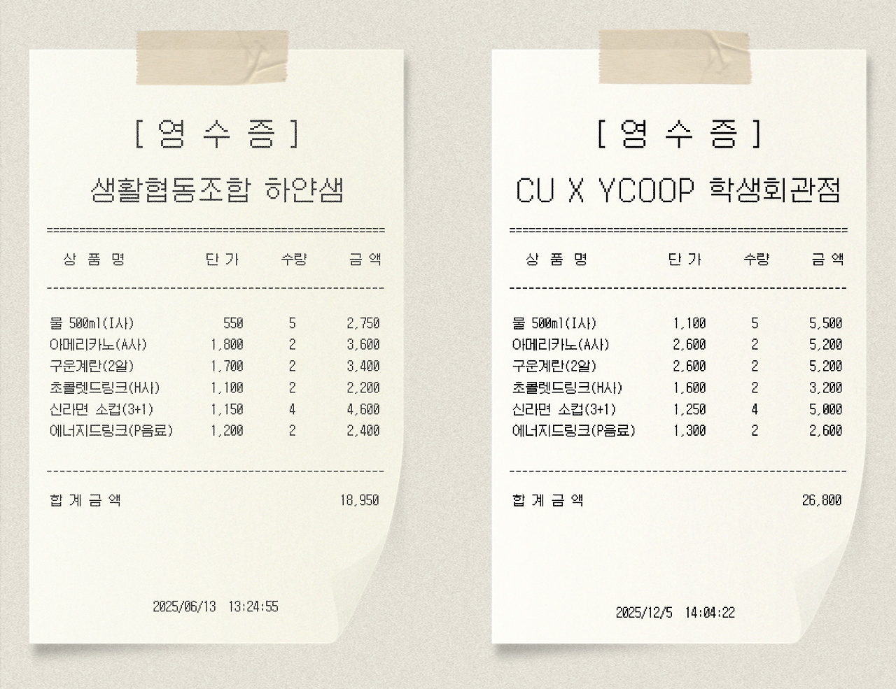 그림1 프랜차이즈 매점으로 전환 전후의 일주일 간 예상 지출을 두 개의 영수증으로 표현한 그림이다. 좌측 직영 매장 영수증에는 생수 550원*5, 아메리카노 1800원*2, 구운계란 1700원*2, H사 초콜릿드링크 1100원*2, 신라면 소컵 1150원*4, P 에너지드링크 1200원*2 도합 18,950원. 우측 프랜차이즈 매장 영수증에는 생수 1100원*5, 아메리카노 2600원*2, 구운계란 2600원*2, H사 초콜릿드링크 1600원*2, 신라면 소컵 1250원*4, P 에너지드링크 1300원*2 도합 26,800원. 직영 매점이 운영했을 때에는 주 평균 예상지출액이 18,950원이었으나, CU 매점이 된 이후 예상지출액은 26,800원으로 인상되었다.