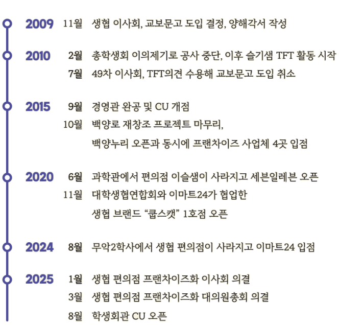 [3] 기존 직영 편의점은 한정된 취급 품목과 잦은 재고 부족 등의 문제가 있어 학생들의 불만이 제기됐다”며 “이러한 문제를 개선하고, 변화하는 유통 구조에 대응하기 위해 조합 내부 의결 절차를 거쳐 프랜차이즈 전환을 결정했다”고 설명했다. 최인규·최유진, "생협 편의점, CU·GS25와 손잡고 재탄생", 연세춘추, 2025년 8월 31일. https://chunchu.yonsei.ac.kr/news/articleView.html?idxno=32355 .