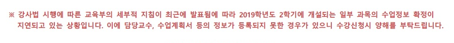 강사법 시험에 따른 교육부의 세부적 지침이 최근에 발표됨에 따라 2019학년도 2학기에 개설되는 일부 과목의 수업 정보 확정이 지연되고 있는 상황입니다. 이에 담당교수, 수업계획서 등의 정보가 등록되지 못한 경우가 있으니 수강신청시 양해를 부탁드립니다.