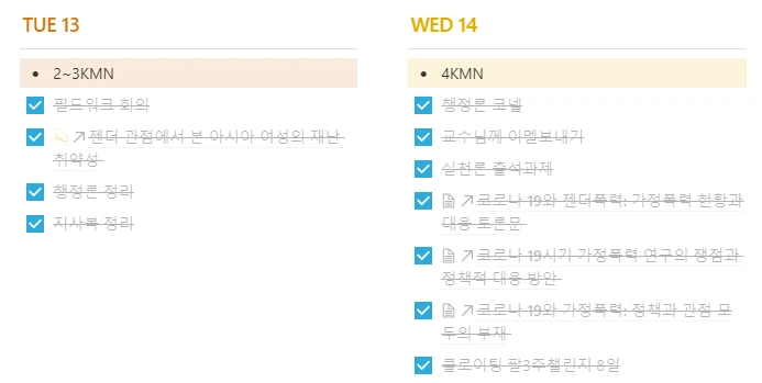 [사진설명] 2020년 10월 13일과 14일에 작성한 노션 체크리스트다. 각각 2~3KMN과 4KMN을 했다고 적혀 있으며 수업 복습, 과제, 논문읽기, 운동하기 등 끝낸 일과에 취소선이 쳐져 있다. 사진설명 끝.