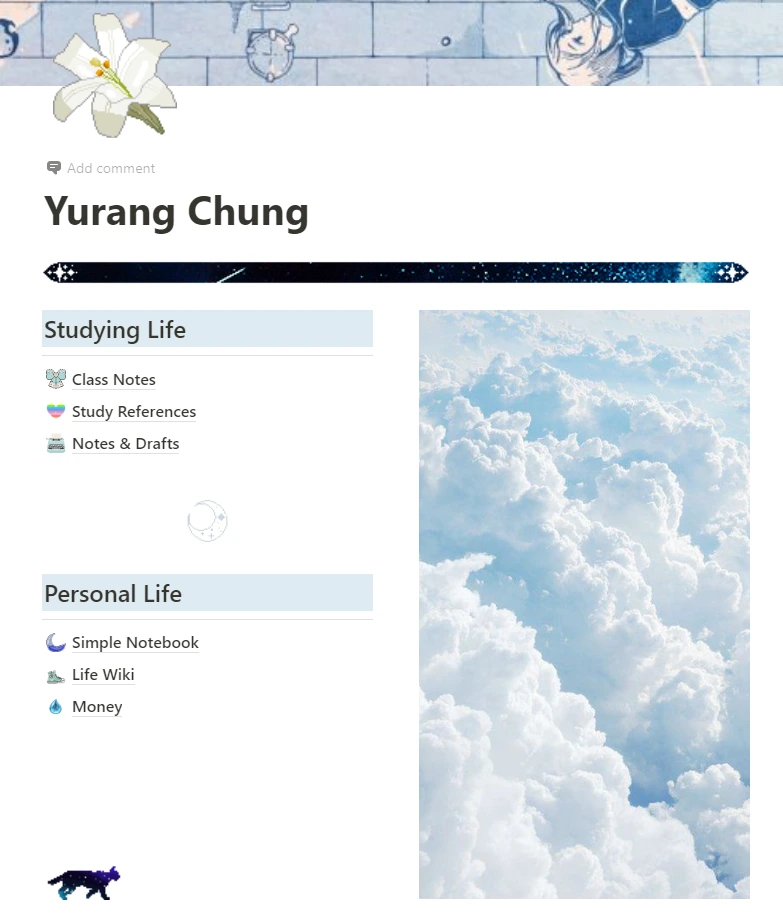 [사진설명] 노션의 첫페이지로 목차가 한꺼번에 나와 있는 페이지다. ‘Studying Life’ 카테고리에는 ‘Class Notes’, ‘Study References’, ‘Notes & Drafts’가 포함되어 있고, ‘Personal Life’ 카테고리에는 ‘Simple Notebook’, ‘Life Wiki’, ‘Money’가 포함되어 있다. 사진설명 끝.