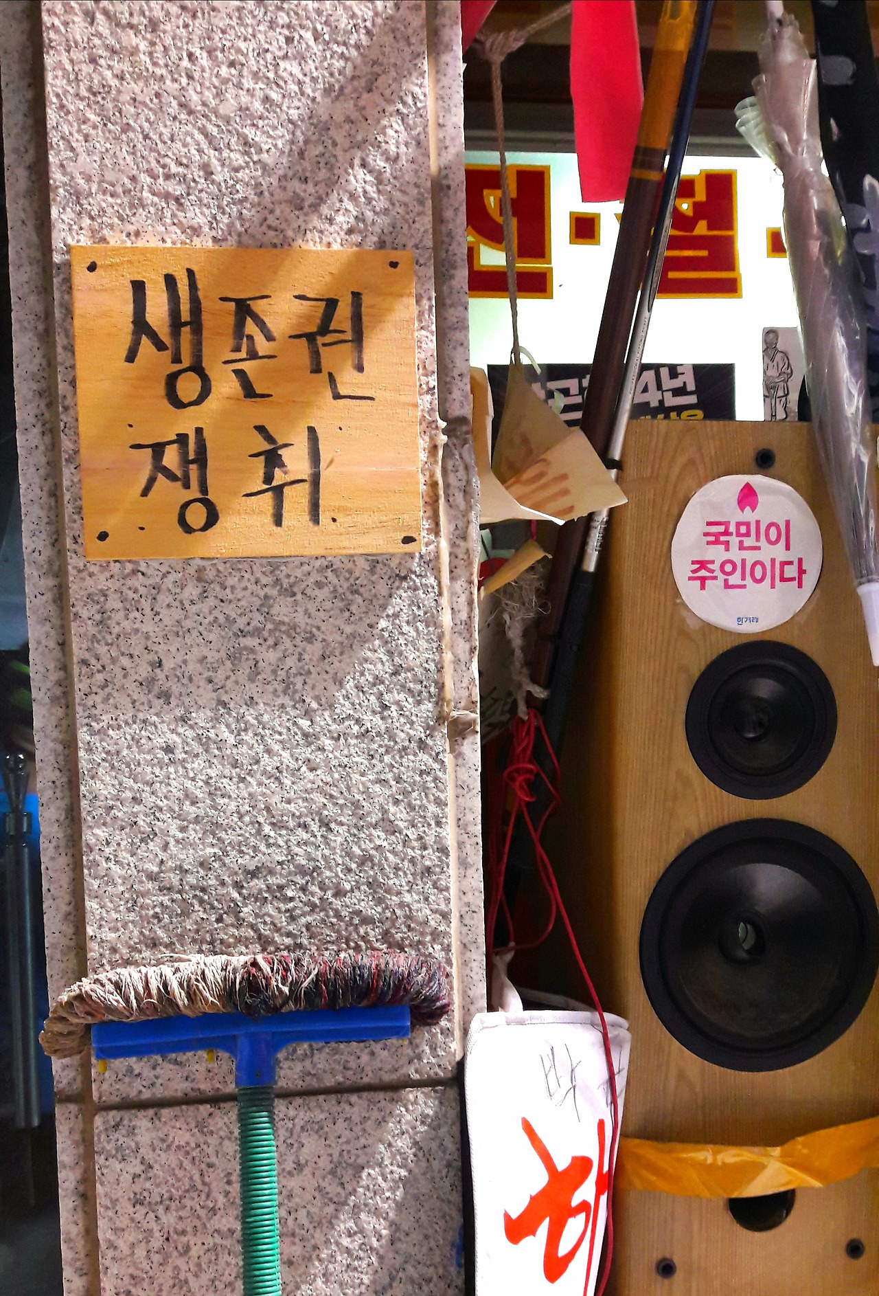 안 나가겠다고 했죠. 몇 사람들은 조용히 동네를 떠나기도 했지만, 남은 사람들은 싸우기 시작했어요. 네, 저기 집회장에 앉아있는 사람들이 우리 동네 사람들이에요. 다른 곳 사람들도 있고. 구청은 전국철거민연합회란 이름만 들으면 알레르기가 나는지, 우리랑 몇 번 상의도 안 해보고 강제집행 명령을 내렸어요. 용역들은 예고 없이 100명씩은 들어왔어요. 몸싸움이 나고, 다치고, 부서지고. 용역들은 우리가 물러나면, 그들 말로 ‘작업이 끝나면’ 건물에다 빨간 스프레이로 동그라미를 그리고 사라졌어요. 정리를 다 했다는 의미였죠. 그리고 얼마 안 가서 그들은 우리 가게에도 들어왔어요.
