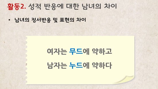 '남녀의 정서반응 및 표현의 차이: 여자는 무드에 약하고 남자는 누드에 약하다'는 성교육 자료. "이것은 결-코 자연스럽지 않습니다. 그래야만 합니다.".투명사회를위한정보공개센터