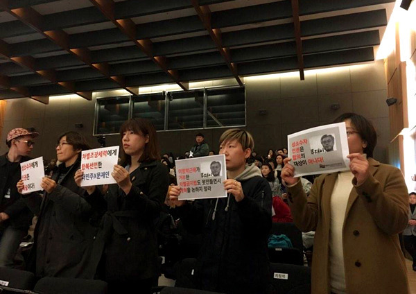 2017년 2월, 인권활동가들이 문재인 당시 대선후보의 유보적 입장에 항의하는 사진. "숙제할 시간은 충분히 드렸으니 그만 미루고 제대로 대답해 주시길." 성소수자차별반대무지개행동