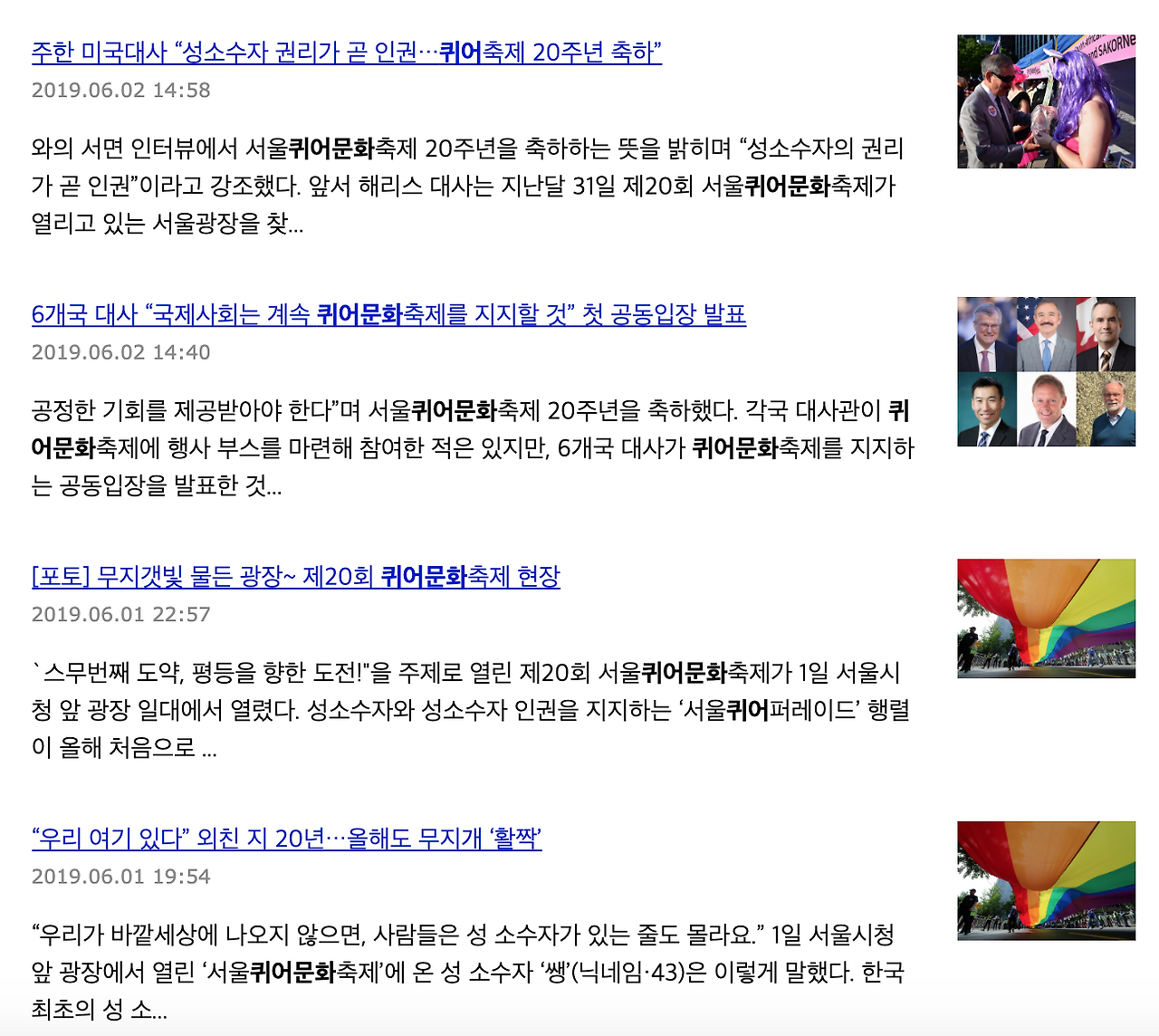 이제부터 한 가지 사건에 대한 세 신문사의 각기 다른 견해를 보기 쉽게 비교해보겠습니다. 무슨 주제를 가져올까 고민하다가, 지난 호의 주제와도 연결이 되는 ‘2019 서울퀴어문화축제’를 화두에 올려보았습니다. 신문사의 이름은 편하게 A, B, C라 칭하겠습니다. 아래는 각 신문사에 ‘퀴어문화’라는 검색어를 입력했을 때 나온 결과입니다.[4]