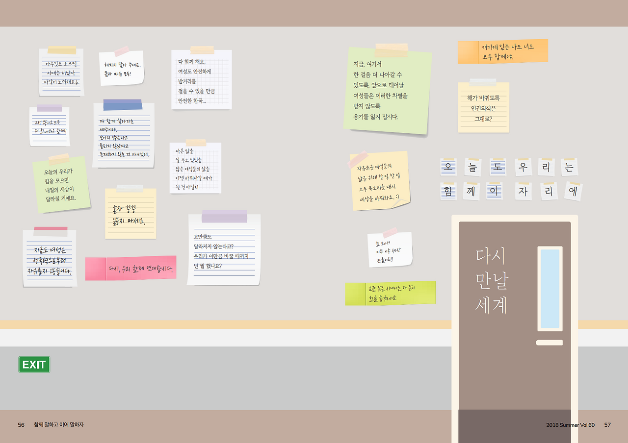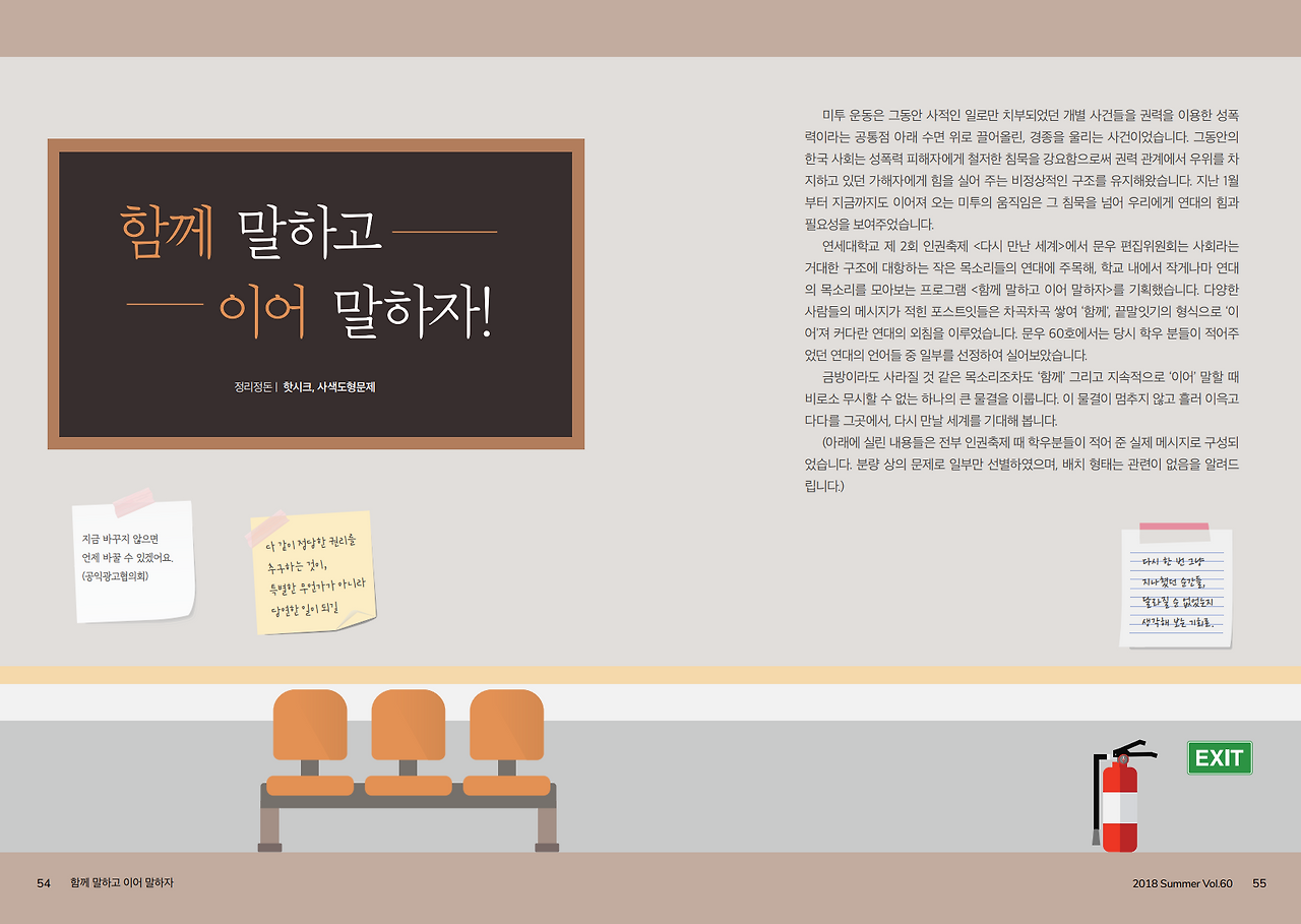 연세대학교 제 2회 인권축제 에서 문우 편집위원회는 사회라는 거대한 구조에 대항하는 작은 목소리들의 연대에 주목해, 학교 내에서 작게나마 연대의 목소리를 모아보는 프로그램 를 기획했습니다. 다양한 사람들의 메시지가 적힌 포스트잇들은 차곡차곡 쌓여 ‘함께', 끝말잇기의 형식으로 ‘이 어'져 커다란 연대의 외침을 이루었습니다. 문우 60호에서는 당시 학우 분들이 적어주 었던 연대의 언어들 중 일부를 선정하여 실어보았습니다.
