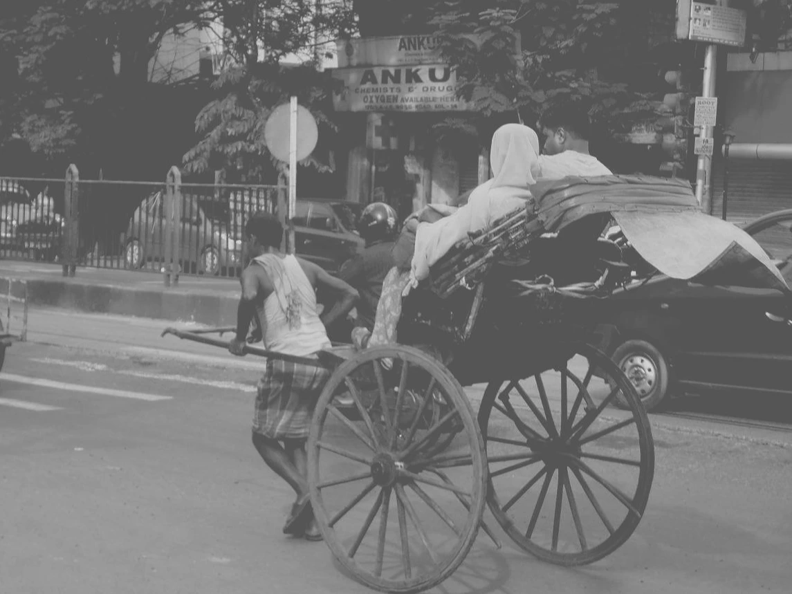 인도의 자전거 릭샤(인력거)는 낡은 삼륜 자전거다. 인력거꾼이 앉는 안장은 딱딱하고, 그 뒤로 무거운 고철로 만들어진 손님 자리에만 쿠션을 깔아 햇빛 가리개를 달아 놓았다. 조금이라도 오르막 길을 올라야 할 때면 릭샤왈라는 안장에서 엉덩이를 떼고 다리에 힘을 줘 가까스로 바퀴를 돌린다. 중간중간 땀이 눈 안으로 들어가 시야를 가리기 전에 목에 건 수건으로 재빨리 이마를 훑어낸다. 힘을 주기 위해 몇 번을 멎었던 숨을 골라내며 목적지에 도착하면 손님에게 손을 내밀어 꼬깃꼬깃한 돈을 받아내야 한 건의 임무가 끝난다.