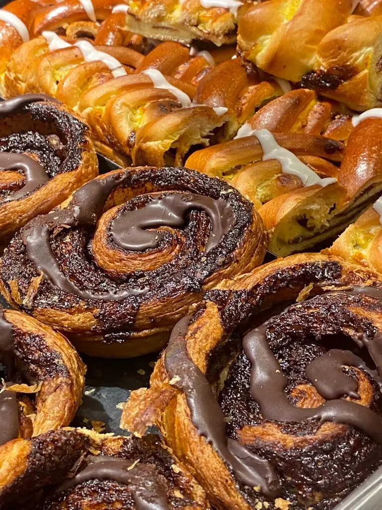 나는 샵에서 덴마크 소시지와 시나몬 롤을 구입했다.
