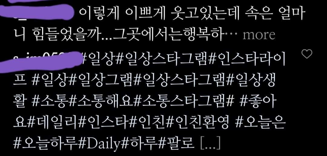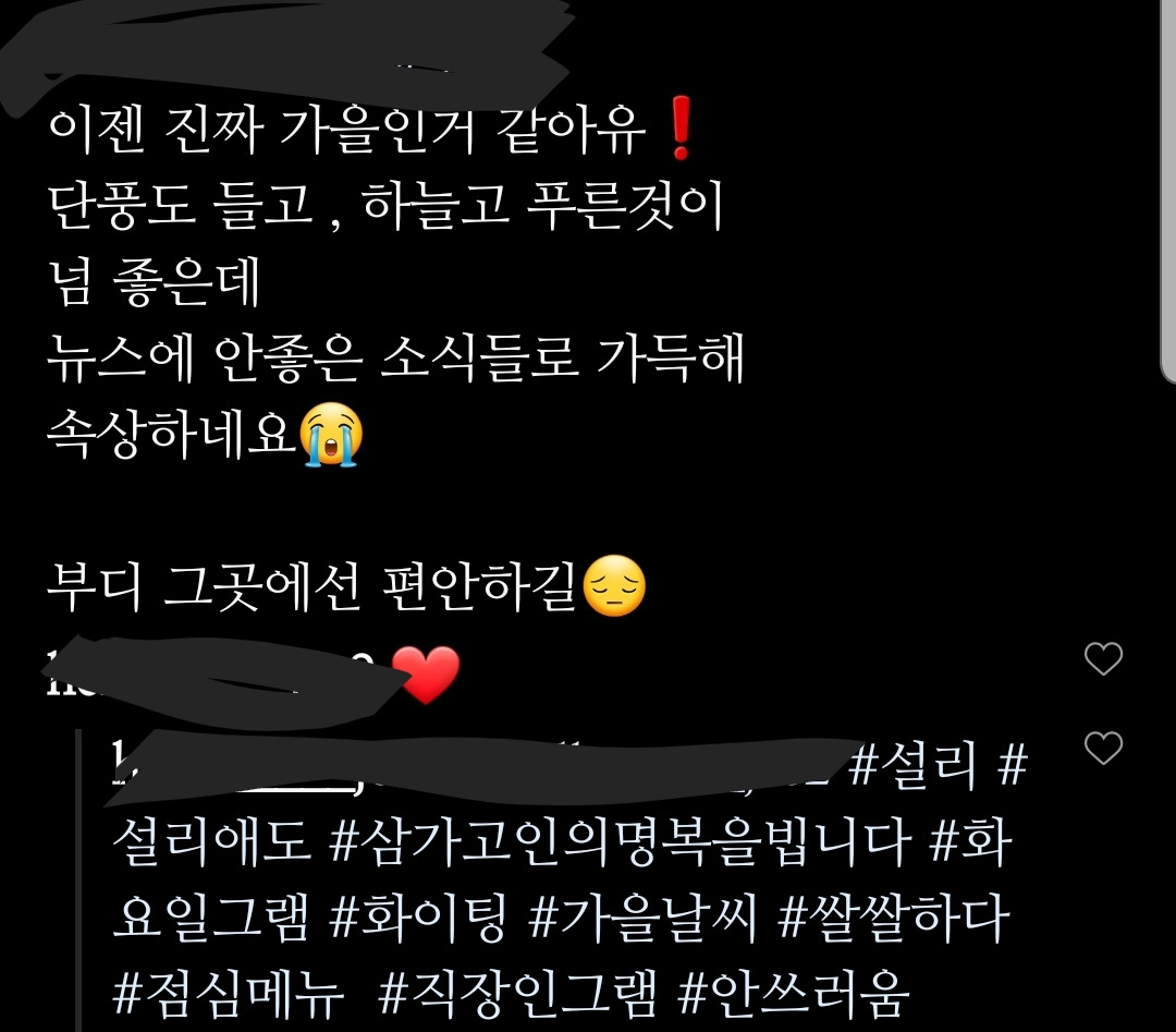 설리의 명복을 빌며 좋아요와 팔로워도 함께 늘리는 그런 목적인 건가. 설리 추모글이라면서 설리 사진도 아니고 본인 사진을 올린 사람들도 몇보였다. 장례식장에 가면 방명록에 이름을 적듯이 내 얼굴을 걸고 추모한다 뭐 이런건가.