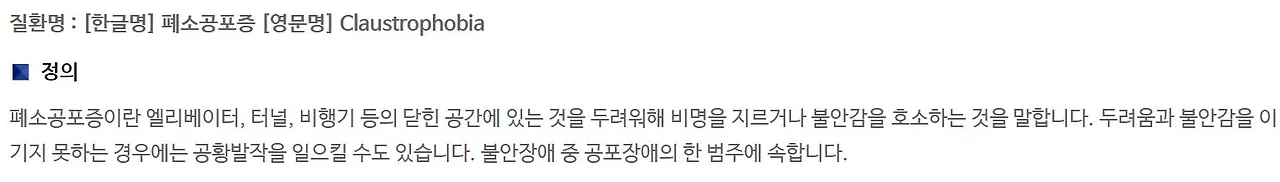 내가 처음 폐소 공포증을 느낀 것은 15살 때 비행기 안에서였다. 야간 비행 중 불 꺼진 컴컴한 비행기 안에서 나는 갑자기 가슴이 콱 막히고 불안해짐을 느꼈다. 그리고 21살 때 뉴욕으로 가는 중 앞이 보이지 않는 칠흑같은 암흑 속의 야간 버스에서 비슷한 증상을 느꼈다.