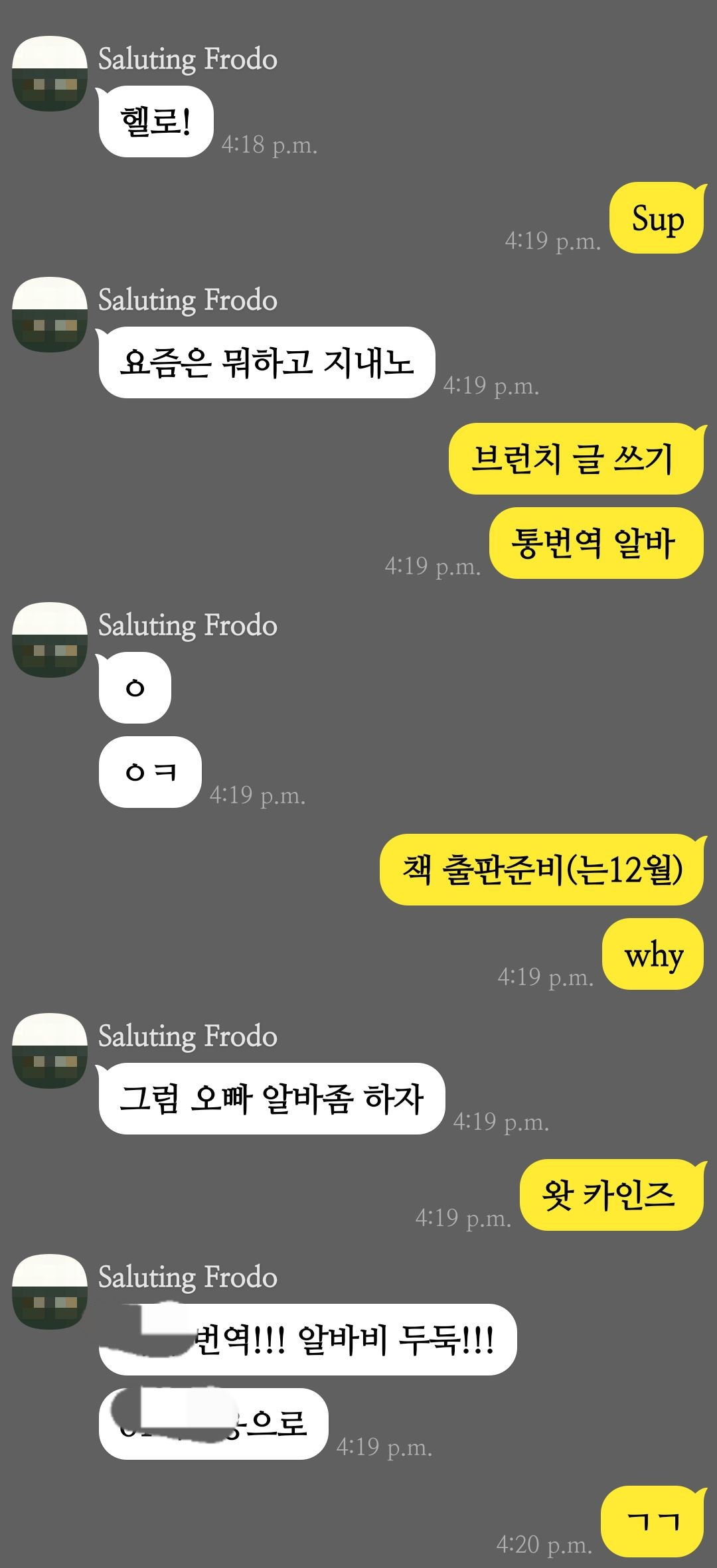 그런데 신기한 것은, 그동안 내가 한 통역과 번역은 에이전시를 끼고 일을 받아서 한 것이 아닌 다 아는 사람들을 통해 알음알음한 것이라는 점이다. 믿기 어려우시다면 오늘 한 카톡을 증거자료로 첨부한다.
