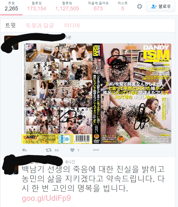 국내 유력정치인이 백남기 농민의 죽음을 추모한답시고 올린 트윗에 일본 AV 표지를 올린 것이다. 물론 해당 트윗은 순식간에 삭제됐고, 해명은 뭐... 해킹당했다 정도로 끝났다. 큰 파장도 없었다. 아직도 한국은 '남자 허리 아래 일은 신경쓰지마라'인가보다.