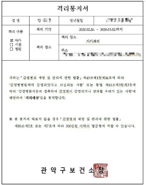 무려 2월 26일자로 찍혀 3월 2일까지 새로 시작되는 자가 격리서가 날아든것이다! 롯데팬 강은 친구 많이 둔 죄로 자가 격리를 두 번이나 당한 셈이 됐다.