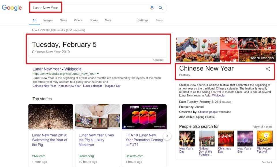 구글 검색화면조차 처참했다. 설날은 음력을 사용하는 한국, 싱가포르, 베트남의 명절이다. 그러나 음력 새해를 의미하는 Lunar New Year를 검색하면 메인 화면에는 Chinese New Year 이라고 대문짝만하게 나왔다.