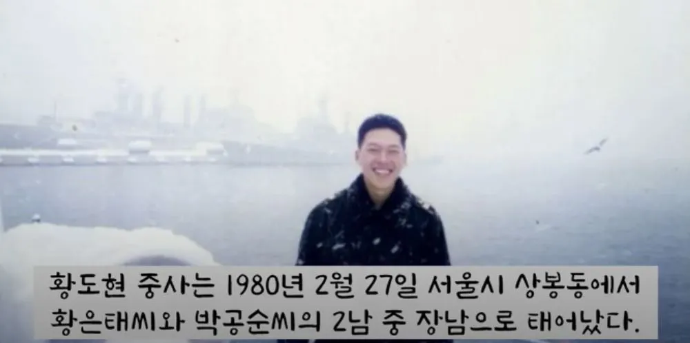 황도현 중사는 1980년 2월 27일 서울시 상봉동에서 황은태 씨와 박공순 씨의 2남 중 장남으로 태어났다.