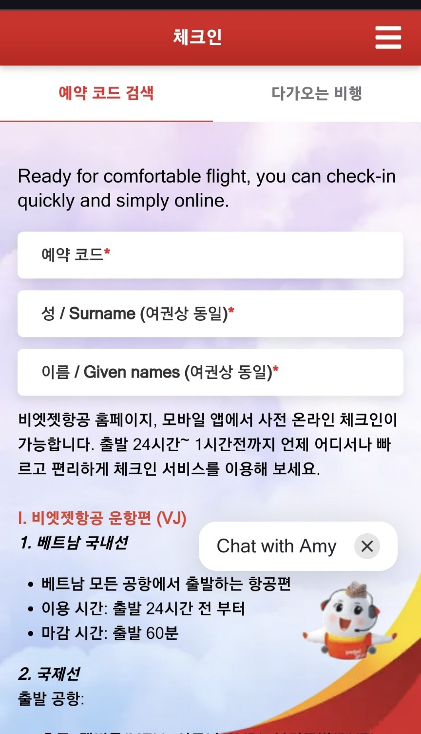 완벽한 한국어 체크인 페이지가 나왔다. 그 외 vietjetair english로 검색하면 영문 체크인 페이지도 나온다.