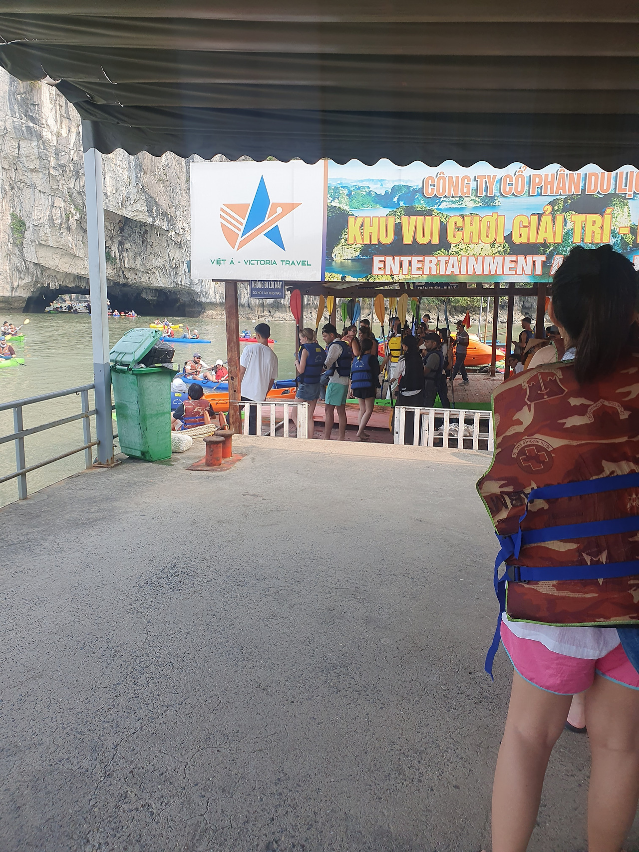2인 1조인데 혼자 카약킹을 하고 있는 날 보고 어느 관광객은 엄지를 치켜올려주며 내 사진을 찍었다. 나 역시 엄지로 화답했다. 카약 위에 앉아 기암괴석들도 구경하고 좀 더 물 위에 떠있고 싶었는데 시간 상 빠져나올 수밖에 없었다. 나는 다른 카약+대나무보트와 부딪혀가며 겨우겨우 선착장에 도달했다. 선착장에 안전요원은 없었기에 다른 외국인 관광객이 내 카약을 선착장에 붙을 수 있도록 끌어줬고, 카약에서 잘못 일어나면 균형을 잃고 물에 빠지기에 나는 기어서 선착장에 올랐다. 그러는 와중에 카약이 다시 바다로 흘러가려 해서 다리 힘으로 카약을 붙잡고, 팔힘으로 선착장을 붙잡아 겨우 기어 올라왔다.