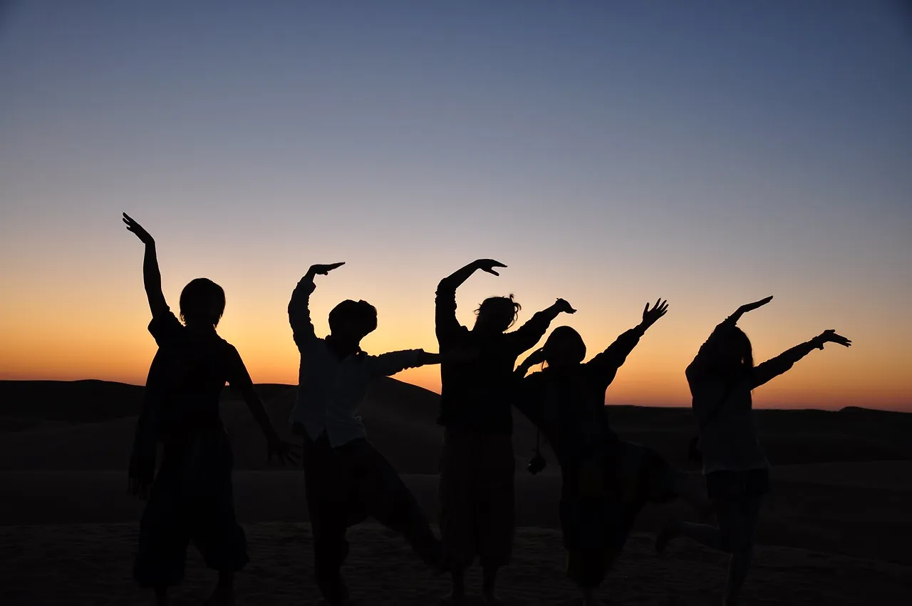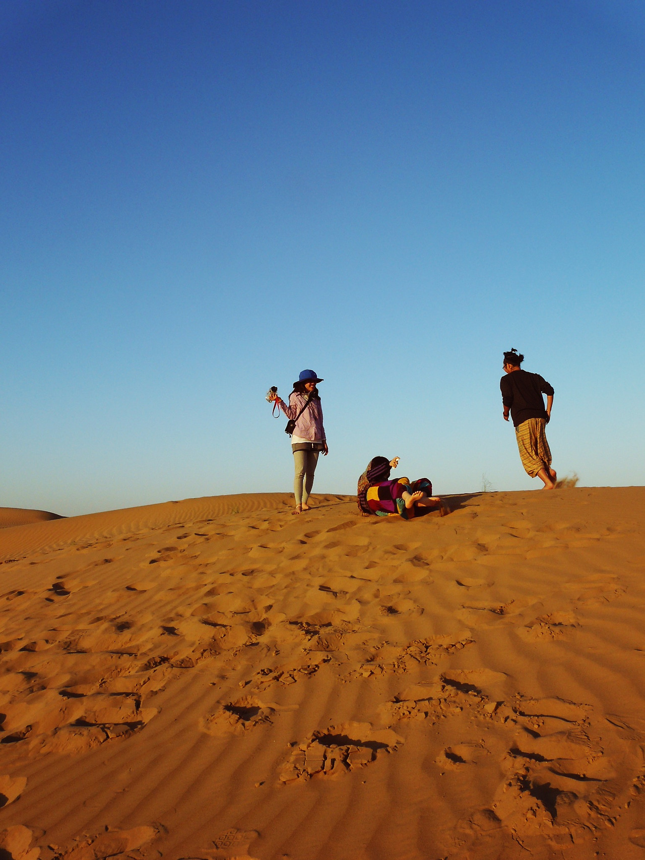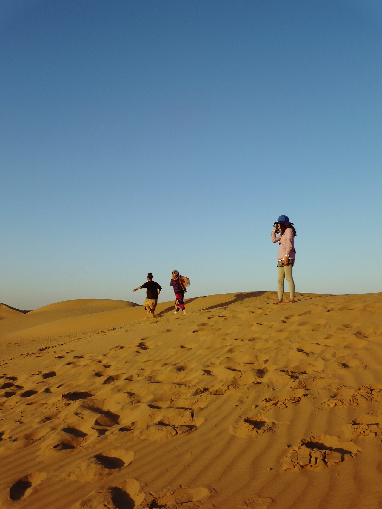 아침 일찍 출발했는데, 거의 저녁이 다 되어서야 고운 모래가루가 보였다. 낙타에서 내려 나는 아이처럼 맨발로 이리저리 뛰어다녔다. 장난도 치고 사진도 찍었다. 주변이 온통 모래였고 그 위는 푸른 하늘이었다.
