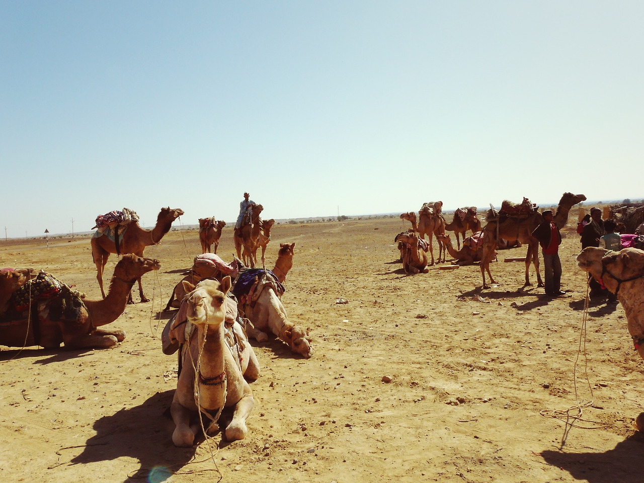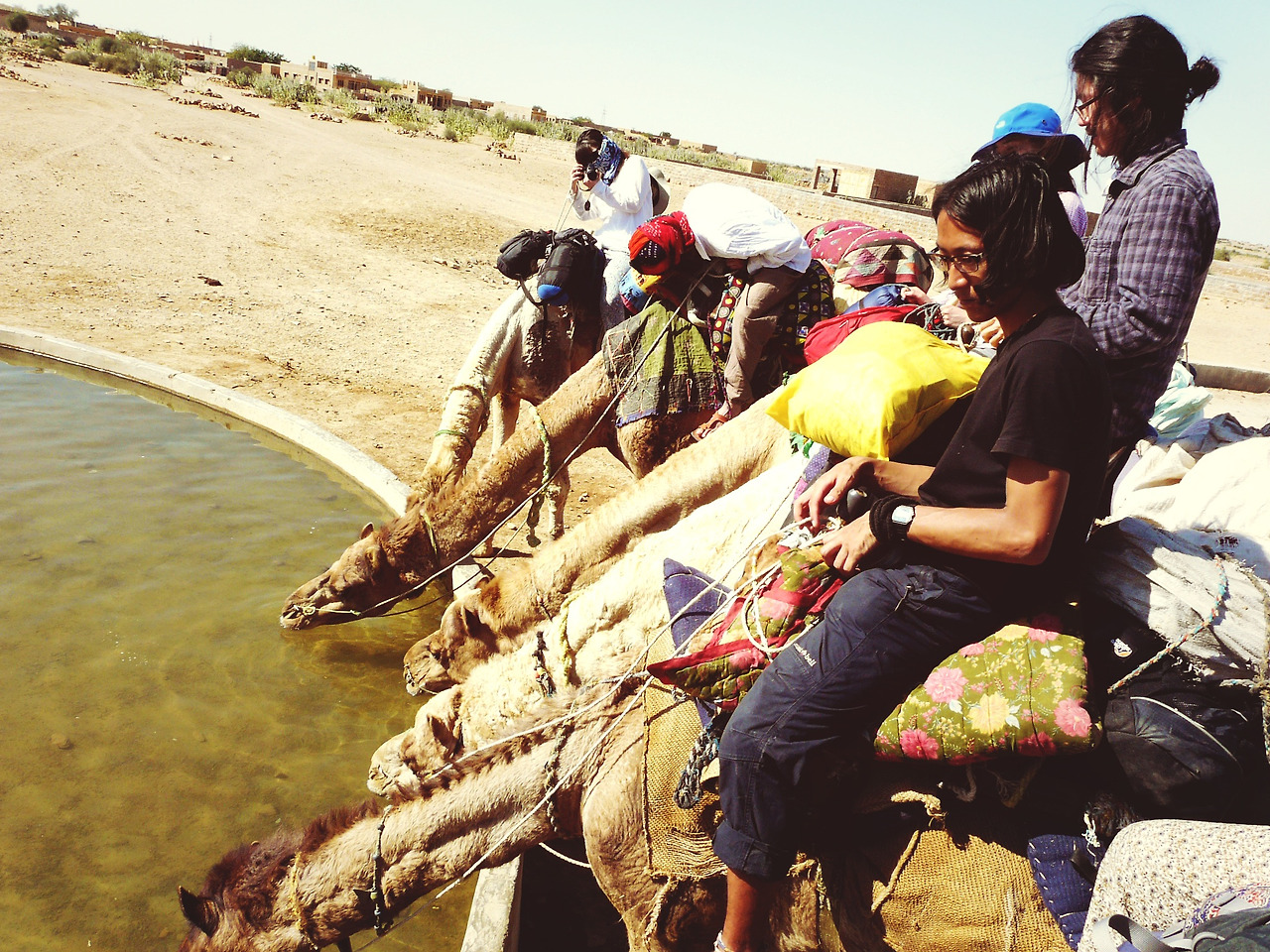 다음 날 호텔 로비에서 사람들이 모였다. 아는 얼굴 1명과 나머지 모르는 얼굴들이었다. 한국인 8명, 일본인 4명 12명의 제법 많은 인원이 함께 했다. 가벼운 인사를 하고 출발지점으로 이동하기 위해 지프니를 탔다. 사막을 이동하기 때문에, 햇빛이 가장 큰 복병이라고 하여 델리에서 산 숄더로 얼굴을 가리고, 알록달록 패치워크 바지에 샌들에 흰 양말을 신기로 했다. 영락없는 현지인의 모습이다. 20분 정도 이동하니 한 구멍가게에 도착했다. 주변에는 낙타가 옹기종기 모여있었다. 사막의 길잡이들과 자신을 펩시맨이라고 소개한 사람과 어린아이 한 명이 우리와 함께했다.