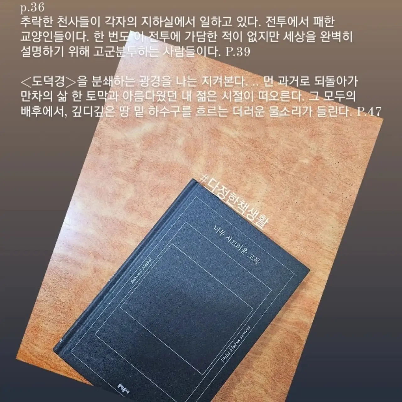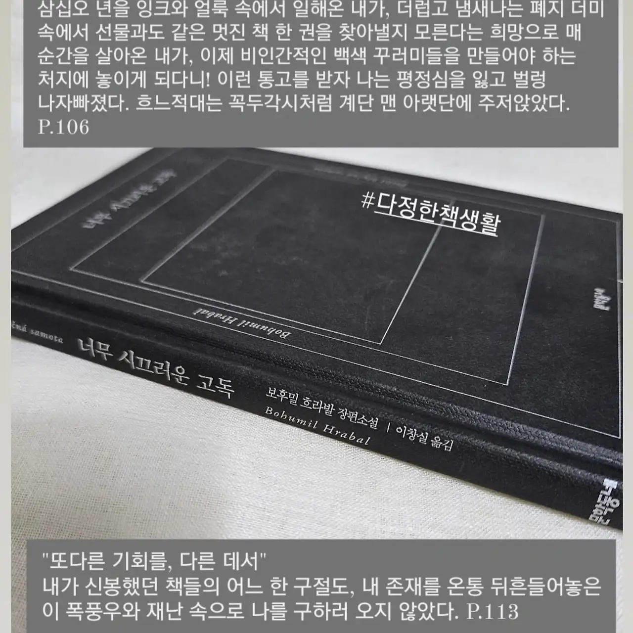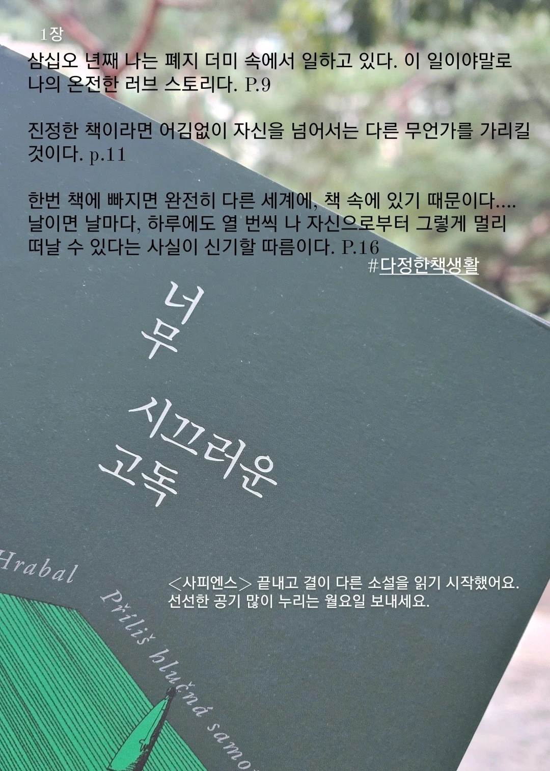 전쟁과 세계의 혼돈을 '시끄러움'에 비유하고, 고독은 자기 침잠의 세계로 묘사된다. 그 중심에는 책이 있다. 《너무 시끄러운 고독》이라는 제목마저도 아름다운 이 작품을 읽을 수 있어 감사한 시간이었다. 보후밀 흐라발은 자신이 이 세상에 온 건 이 책을 쓰기 위해서였다고 한다.