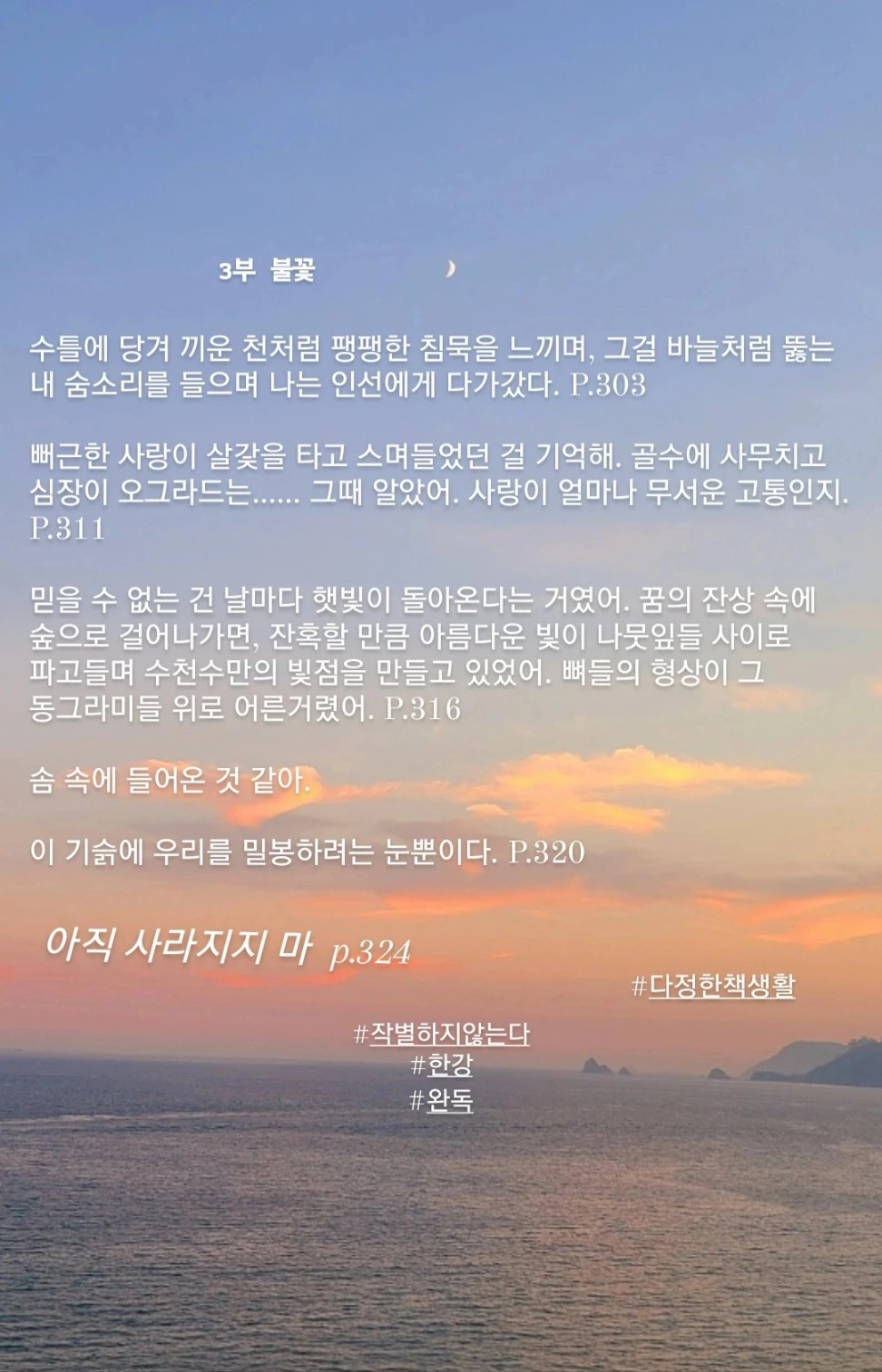 무언가를 알기 전과 알고 난 후는 분명히 다르다. 한번 알게 되면 우리는 더 이상 잊을 수 없다. 그 기억은 어느새 우리 안에서 조용히, 그러나 끈질기게 자리 잡는다. 이 책을 통해 나는 또다시 그 사실을 깊이 느꼈다. 한강 작가의 <작별하지 않는다>는 우리가 외면했던 과거를, 이제는 마주 보고, 온전히 기억해야 할 과거임을 아름답고도 서늘한 문장으로 일깨워 준다.