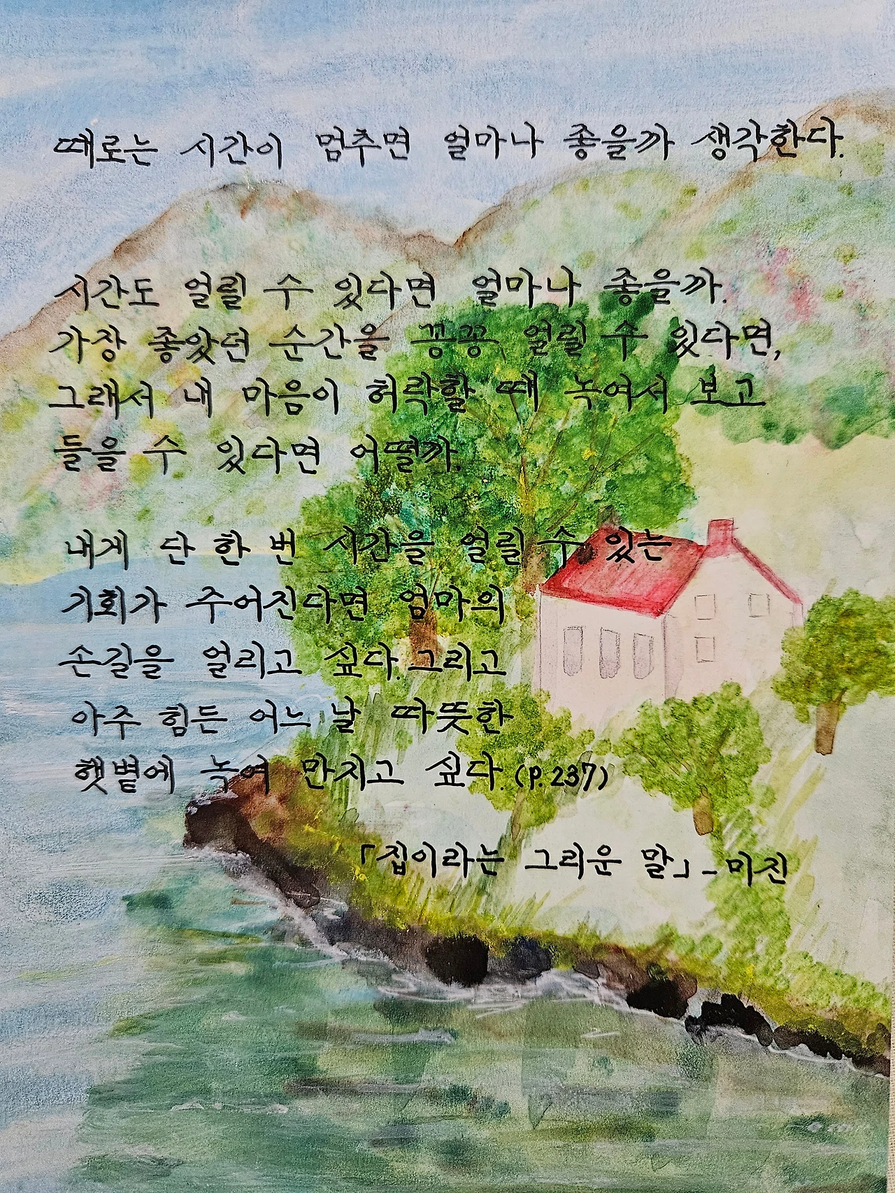 내게 단 한 번 시간을 얼릴 수 있는 기회가 주어진다면 엄마의 손길을 얼리고 싶다. 그리고 아주 힘든 어느 날 따뜻한 햇볕에 녹여 만지고 싶다." (P.237)