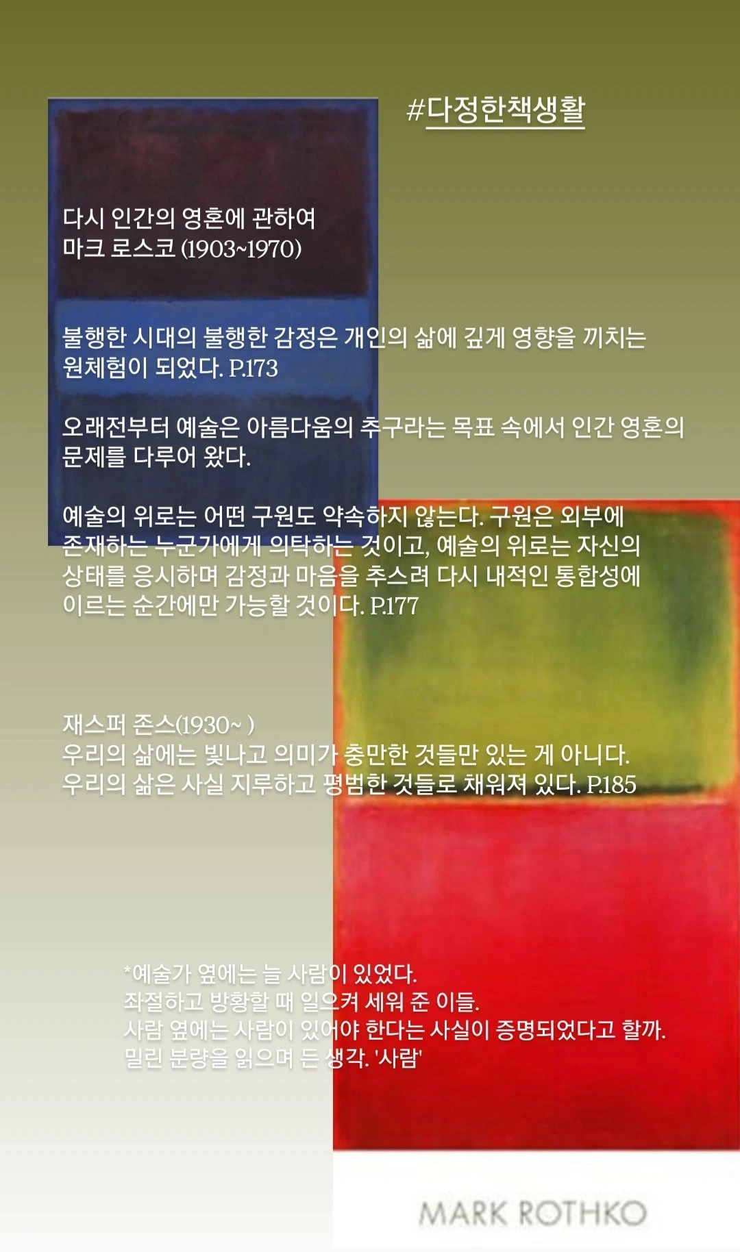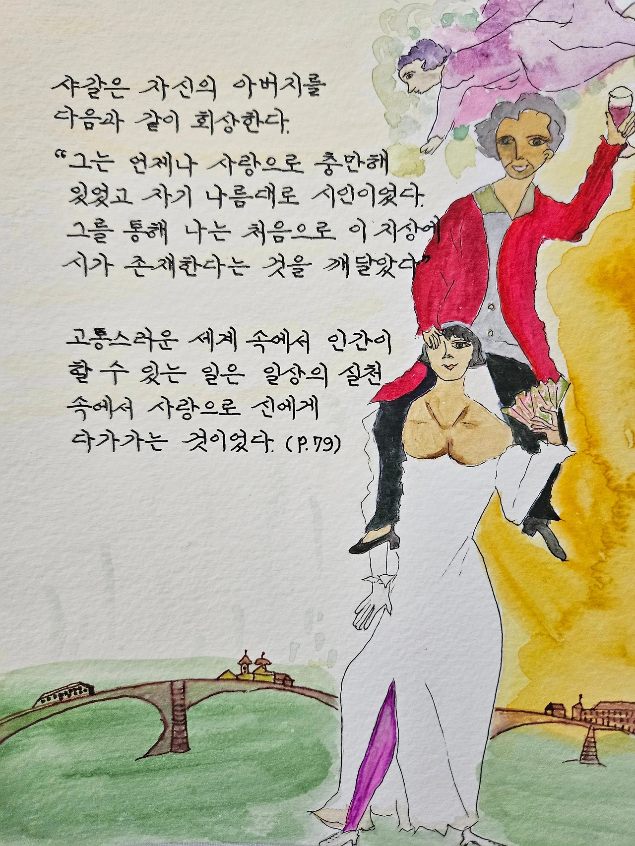 예술은 현실과 너무 멀어져도 안 되지만, 그렇다고 현실에만 붙들려 있어서도 안 된다고 생각한다. 예술은 어쩌면 이상에 더 가까운 것일지도 모른다. 그래서 샤갈의 사랑에 대한 믿음과 낙관주의는 내가 추구하고 싶은 삶의 방향을 아름답게 보여준다. ‘사랑은 거친 세상을 흘러가는 한 줄기 시와 같은 이미지’라는 말은 예술이 내게 전하는 가장 깊은 울림이다.