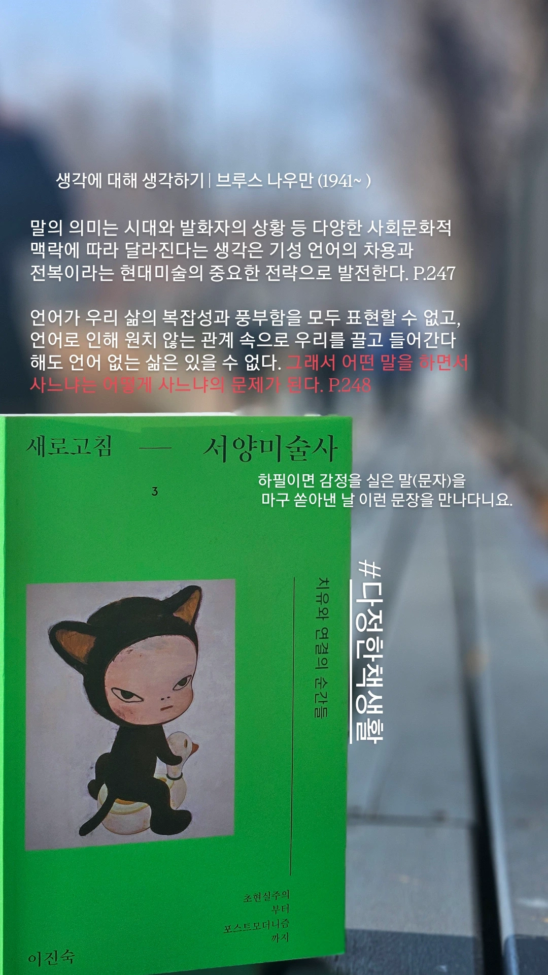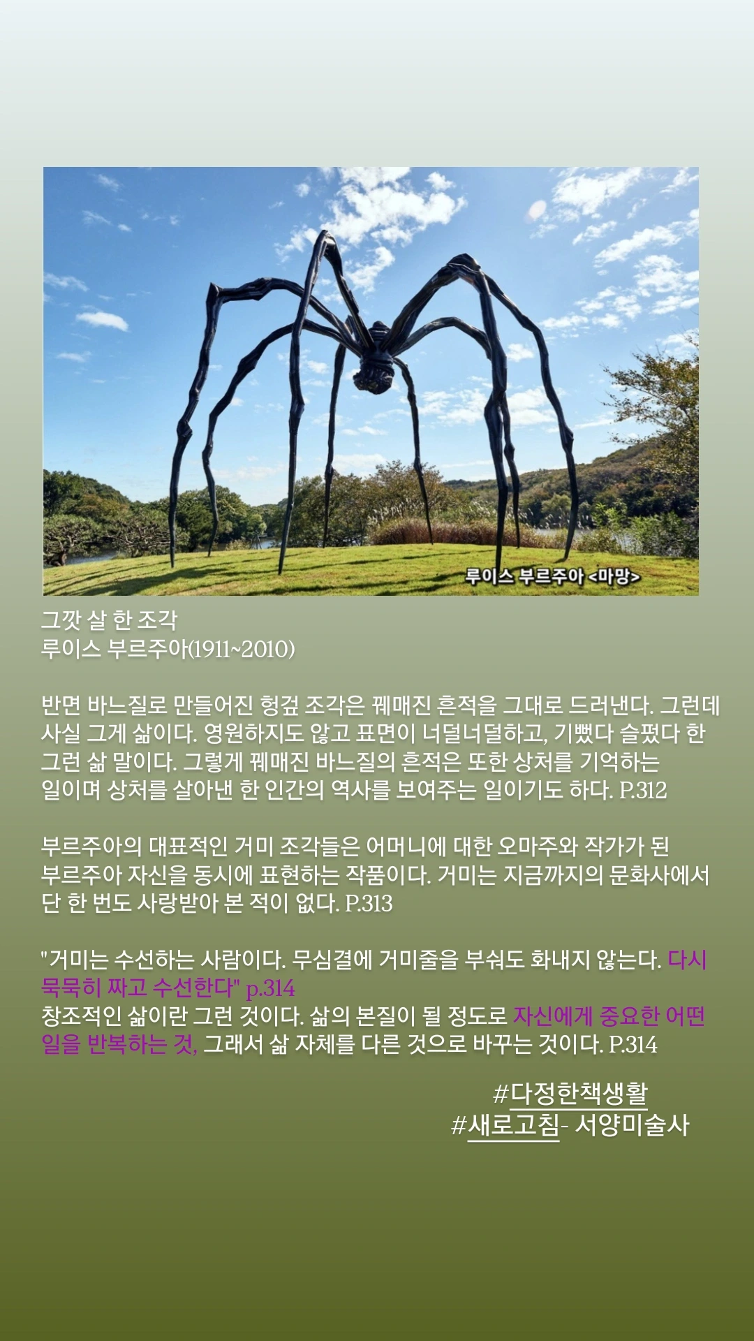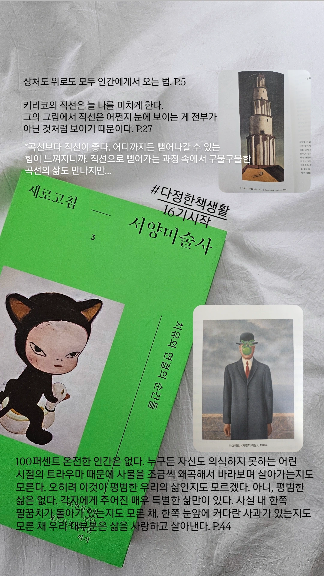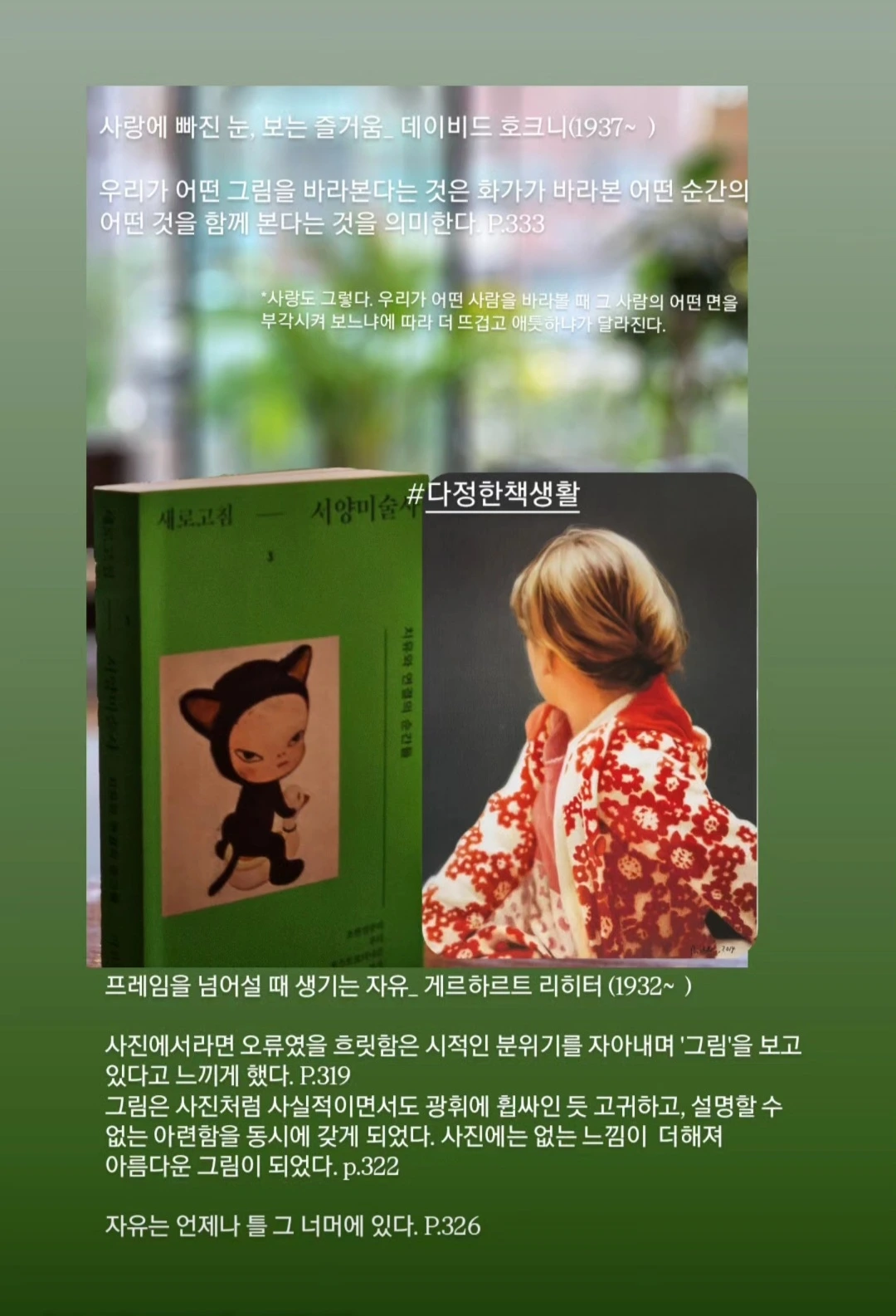 『새로고침 - 서양미술사 3』을 먼저 읽었지만 1, 2권도 읽어 보고 싶다. ‘새로고침’이라는 말에는 미술사를 새롭게 만든 예술가들을 소개한다는 의미도 담겨 있을 것이다. 그 말을 떠올리며 나 역시 이 봄에 조금은 새로고침 되고 싶다. 많은 것을 발견하고 마음에 새기고, 다시 글로 길어 올리는 봄이고 싶다.