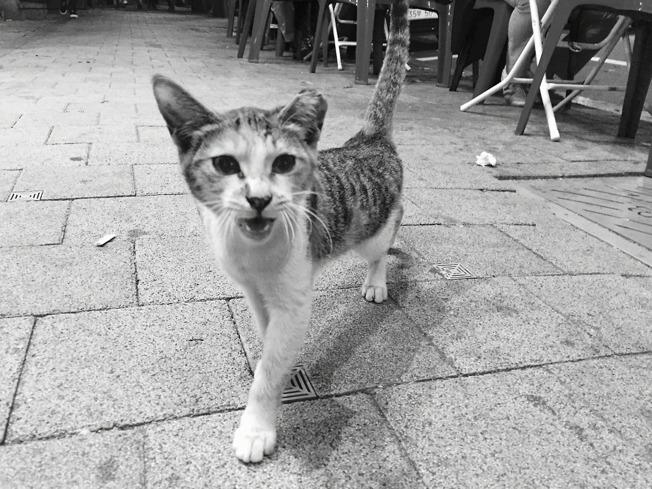 한쪽 귀가 짧은 아이를 보게 되었다. 너는 참 붙임성이 좋구나. 맥주집 노천 테이블에 앉아 있는 손님들의 다리 사이를 이리저리 통과해 다니며 애교를 부리던 중 카메라를 들고 가만히 쪼그려 앉아 있는 나를 발견했다. 오지랖 넓은 이 녀석이 나에게도 조르르 걸어온다. 그러더니 몇 발자국 앞에 멈춰 서서 '야옹-'하고 뭐라 말을 건다. 반갑다는 건지, 니가 뭔데 날 함부로 찍고 난리냐는 건지는 몰라도 음성도 참 귀엽네 싶어 나도 거기에 화답해줬다. 야옹.