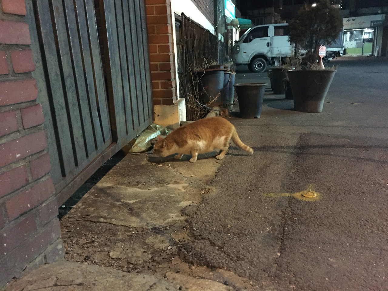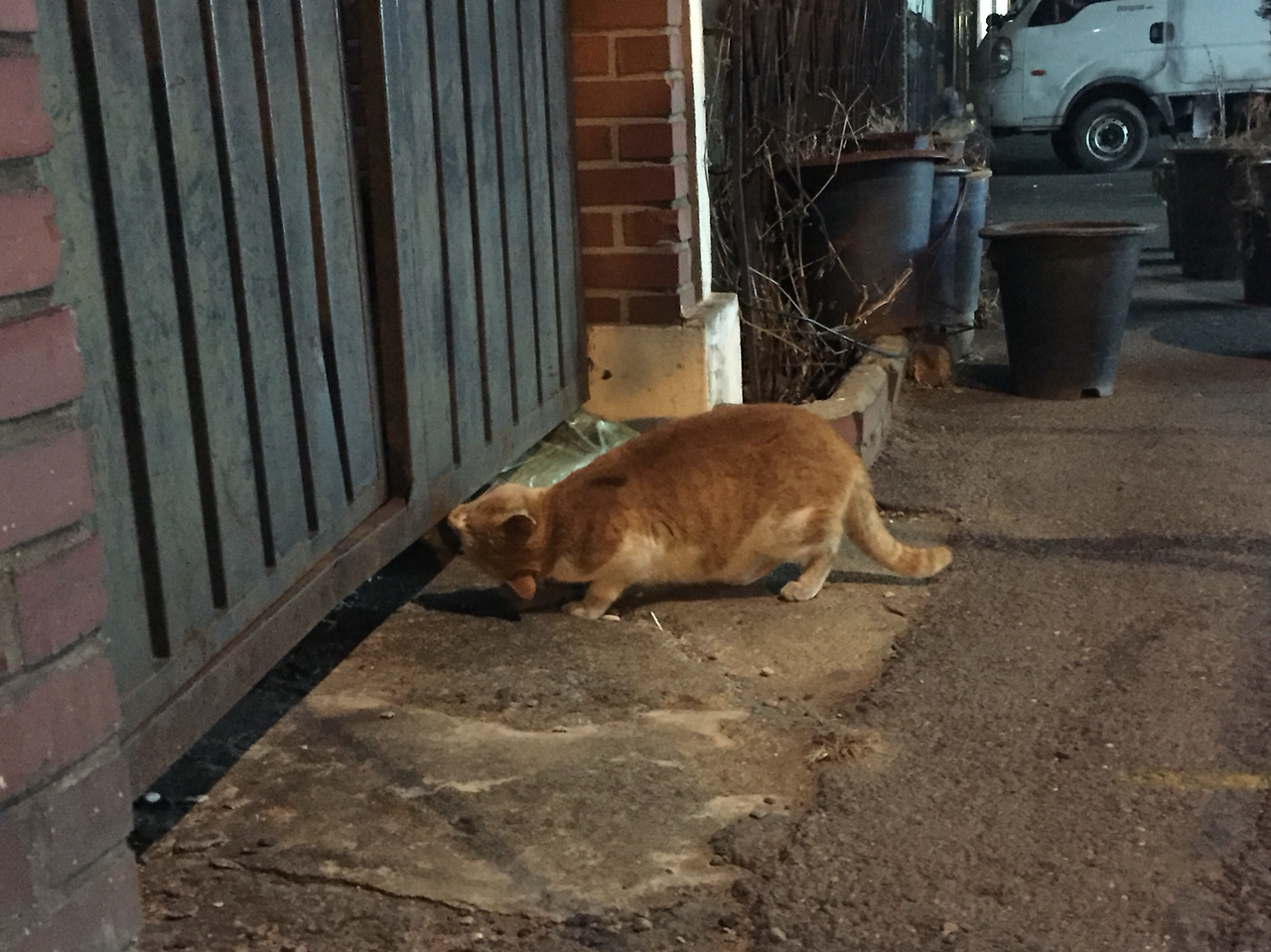 오동통하고 귀여운 녀석을 본 적이 있다. 등에는 해변가의 모래 같은 망토를 걸친 놈이었는데 행색을 보아하니 집에서 잠깐 마실 나온 녀석은 아닌 것 같고 어슬렁거리며 먹을 것을 찾아다니는 참이었나 보다. 어느 낯선 집의 대문을 어찌나 핥아대던지. 그 포동포동하던 몸짓이 귀여워 나도 길가에 쪼그리고 앉아 스텔스(stealth) 모드로 숨을 죽이고 휴대폰을 꺼내 조심히 요놈을 카메라에 담았다. 대문짝에 먹을만한 게 붙어 있을 리가 없지 않나. 얼마나 배가 고팠으면 저러고 있나 싶어서 참치캔이라도 한 개 사서 먹여주고팠지만 결론적으로는 그러지 않았다. 길에서 저렇게 먹이를 찾아다니는, 말하자면 '홈리스'고양이인 것인데 그렇게 못 얻어먹고 다니는 것 치고는 몸집이 어찌나 오동통하던지 마치 임신을 한 것 같기도 했다. 하지만 가만 보니 녀석의 모습이 어쩐지 어딘가 불편해 보이고, 목도 굵고 걸음걸이도 시원찮은 것이 분명 정상은 아닌 것 같았다.