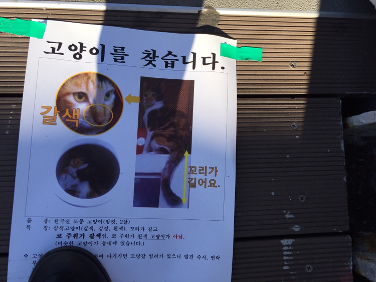 서로가 만나 가족이 되었다. 고양이를 잃어버렸고 그 고양이를 찾기 위해 간절한 마음으로 동네방네 소문을 내는 모습이 저 종이 한 장에서 고스란히 전해진다. 혹시라도 친절한 누군가가 고양이를 잡아주려다 도망이라도 칠까 봐 자세히도 적어놓는 저런 간절함 말이다. 육교 난간에 붙이면 지나가는 사람들이 무심히 지나칠까 봐 발걸음 끝에 한 번이라도 바라봐 달라고 바닥에 붙여놓은 주인의 마음이 지나다니는 흔한 길고양이도 한번 더 쳐다보게 만든다. 하마터면 궁금해서 전화를 걸 뻔했다. 댁의 고양이는 찾으셨나요?