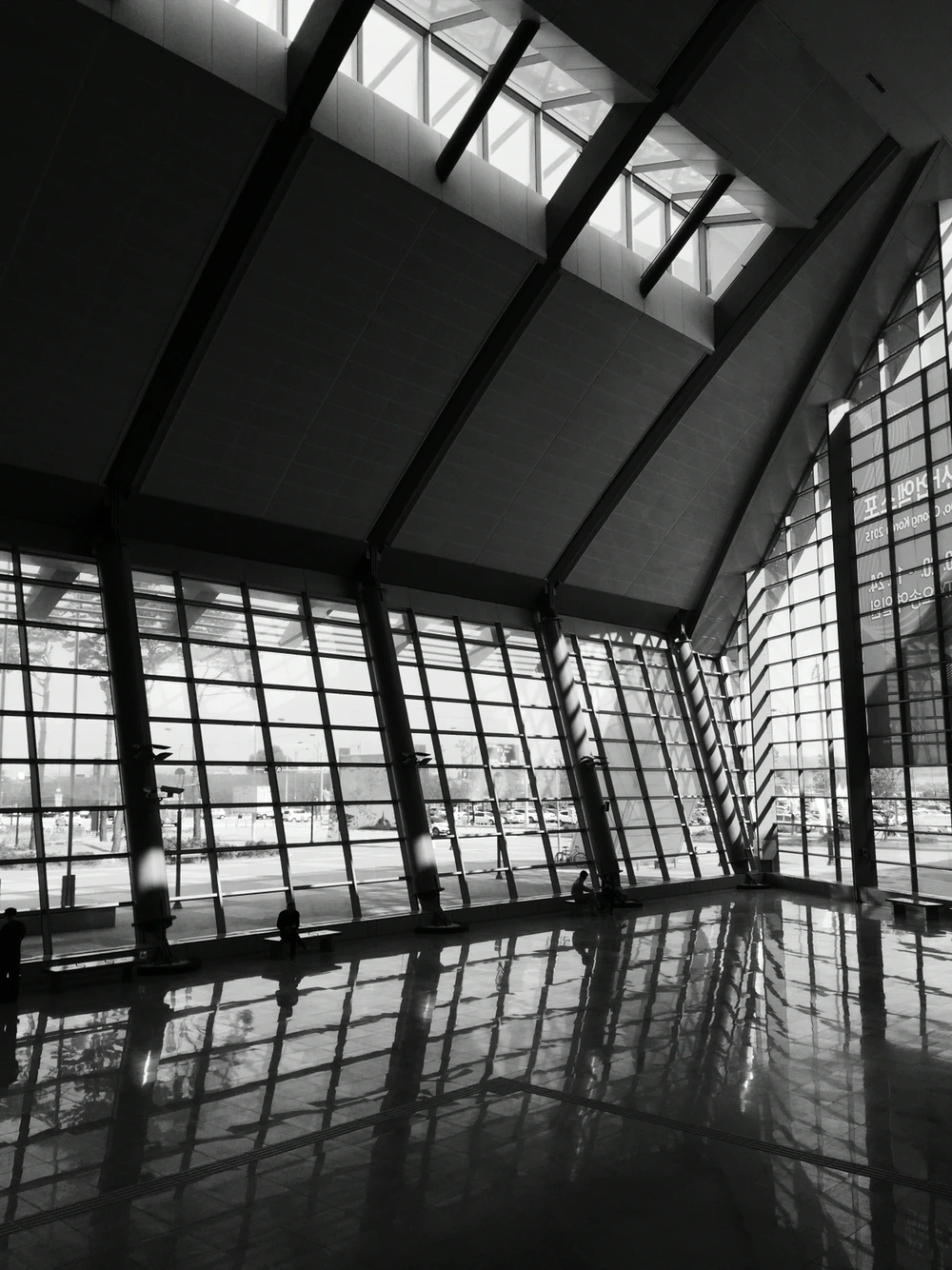 건물 내부는 새 건물답게 아주 깔끔한데 1층 로비에서 부터 몇개의 층에 걸친 큰 창이 있다.(건축과 인테리어에 관한 내 상식수준으론 창이라는 것 이상의 표현은 불가하다.) 그 창가엔 실내 벤치가 있는데 사선으로 기울어져 있는 벽면 아래에서 폭 안기듯이 위치 해 있고, 창가로 빛이 한껏 들어오지만 바깥에 있는 구조물들 덕분에 그렇게 눈이 부시지는 않았다. 나에게 몇시까지 참석하라는 시간제한이 없었다면 아마도 난 거기서 일정 시간을 보내다가 왔을 것이다. 책을 읽거나 음악을 듣거나 또는 나의 사회적 지위(가 있다고 치고)와 체면만 허락한다면 벤치에 누워서 한숨 청했을지도 모르는 일이다. 역 건물은 세련되고 멋진반면 주변은 허허벌판이기 때문에 어떻게 보면 재난SF영화에서 흔히 나올법한 생존자들이 모여있는 아지트 같다는 인상을 풍겨준다. 왜 그런 것 있지 않은가. 폐허가 된 도시에서 각종 외계인의 침략과 바이러스, 좀비 이런 것들로부터 자신들을 보호하기 위해 건설한 비밀스럽고 폐쇄된 안전지역에서 한 세대의 인류가 삶의 터전을 만든 것 같은 그런 느낌 말이다.