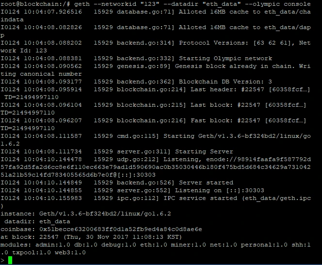 이후 몇 가지 명령어를 더 입력하면 geth(이더리움)가 설치된다. 이더리움에는 로컬 환경에 테스트가 가능하다. 따라서 테스트용 블록체인 네트워크를 구축했다. 그리고 이더리움 콘솔을 띄웠다.