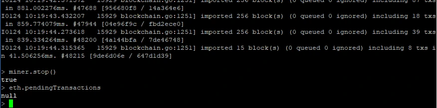 다시 채굴이 시작되었고, 마냥 기다릴 수 없어서 miner.stop()을 이용하여 채굴을 중지했다. 그리고 확정되지 않은 트랜잭션이 남아 있는지 확인 했다.
