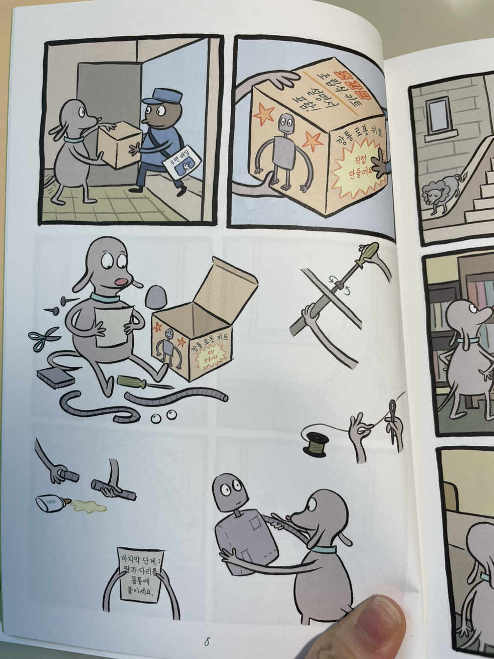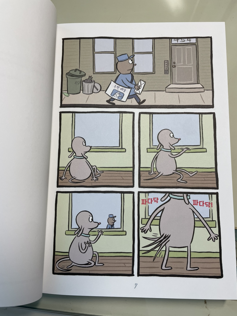 그래서 결말에서 로봇은 창 밖의 도그를 보고도 붙잡으러 가지 않는다. 이때 로봇이 도그를 발견한 창은 동그란 모양으로, 도그가 남들의 삶을 훔쳐보고 부러워하던 통로인 네모난 창틀과는 상반된 형태다. 정수 작가님의 글을 인용하자면 이 세계를 이루는 기본 틀은 직선적이고, 이 직선들이 규정하는 나와 타자의 분명한 경계에 의해 자유로운 감정들은 제약받는다.