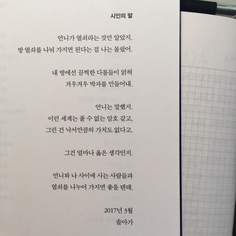 덧) 우연찮게 임솔아의 시집, 김사월의 헤븐, <피리 부는 여자들> 중 서한나의 ‘끝나지 않는 춤을 추고’를 한꺼번에 읽고 듣는 호사를 누렸다. 좋아하는 시인 중 김사월과 어울리는 건 김이듬과 허연일 거라고 단정 짓곤 잊어버렸는데 임솔아도 꽤 잘 어울렸다. “잠 안 와서 힘들지”. 눈 감고 하는 그 말에 니가 날 사랑하는 줄 알았네.(서한나, 82쪽) 같은 문장은 말할 것도 없고. 며칠을 허덕이며 소화하고 나니 나도 간만에 애써 사랑을 하고 싶네. 애쓰는 사랑을 계속 계속.