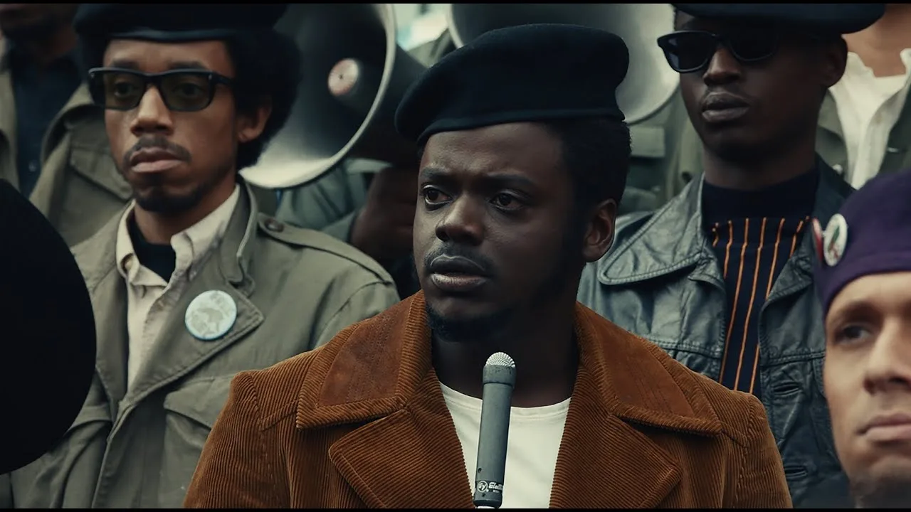 <유다 그리고 블랙 메시아>는 그렇게 처형당한 프레드 햄프턴이 생전에 어떻게 '블랙 메시아'로 완성되었는지 그 짧고 불타는 시간을 담은 영화다. 그러니 <트라이얼 오브 더 시카고 7>를 먼저 본 관객으로서 나는 그가 맞이한 비극적 결말을 이미 아는 상태로 관람하는 게 당연할진대, 사실 영화를 보는 내내 두 인물이 동일 인물이라고 연결하지 못했다. 영화 후반부에야 번뜩, 아 설마 그 법정의 '어린 프레드'가 이 '체어맨 프레드'였던 건가? 그 프레드 역시 일리노이에 기반을 둔 흑표당이었는데 그게 같은 사람인 거구나! 하고 뒤늦게 깨달았다.