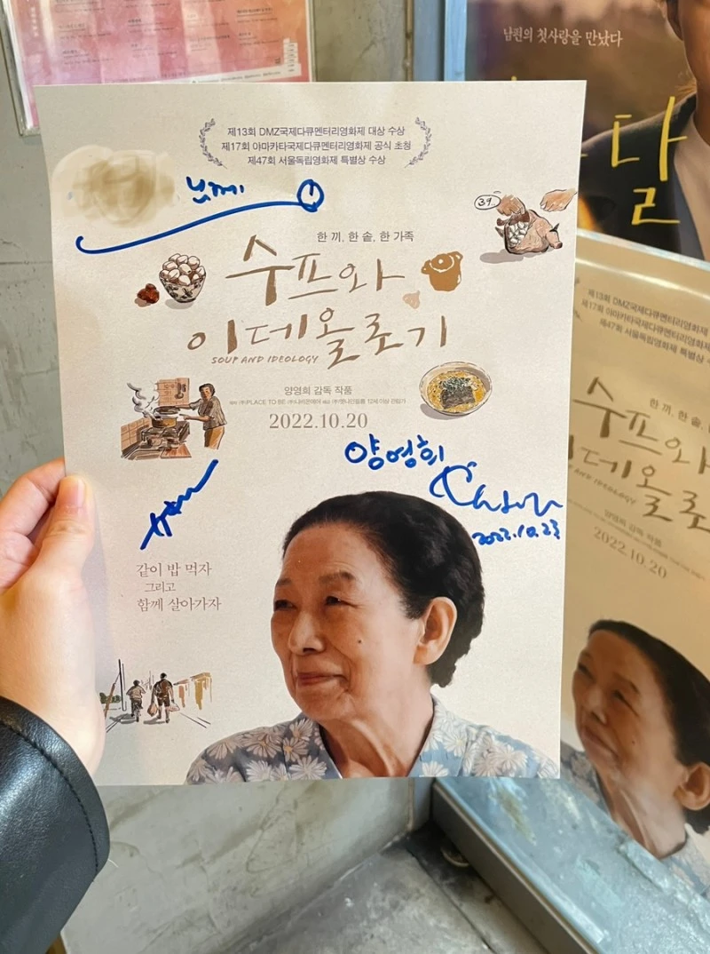 <수프와 이데올로기>라는 제목은 양영희 감독이 '어느 나라에서도 제멋대로 번역되지 않았으면' 하는 바람을 담았다고 한다. 영화에선 총 세 번 닭 수프를 끓이는 장면이 나온다. 카오루가 처음 오사카 집에 찾아온 날 어머니가 끓여주신 백숙. 편한 옷을 입은 카오루와 어머니와 영희 셋이 장을 보고 함께 요리하며 만들어 먹은 백숙. 마지막으로, 기력 없고 아픈 어머니에게 카오루가 직접 끓여드린 백숙. 그들이 그렇게 쌓아간 시간만큼, 가족이 되어간 만큼, 사람(을 이해하고 싶어 하는 마음) 없인 사람으로 못 산다는 생각을 다시금 꼭꼭 씹어 소화시킨다.