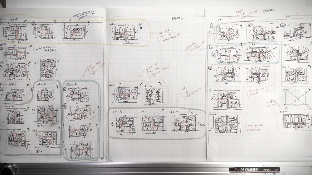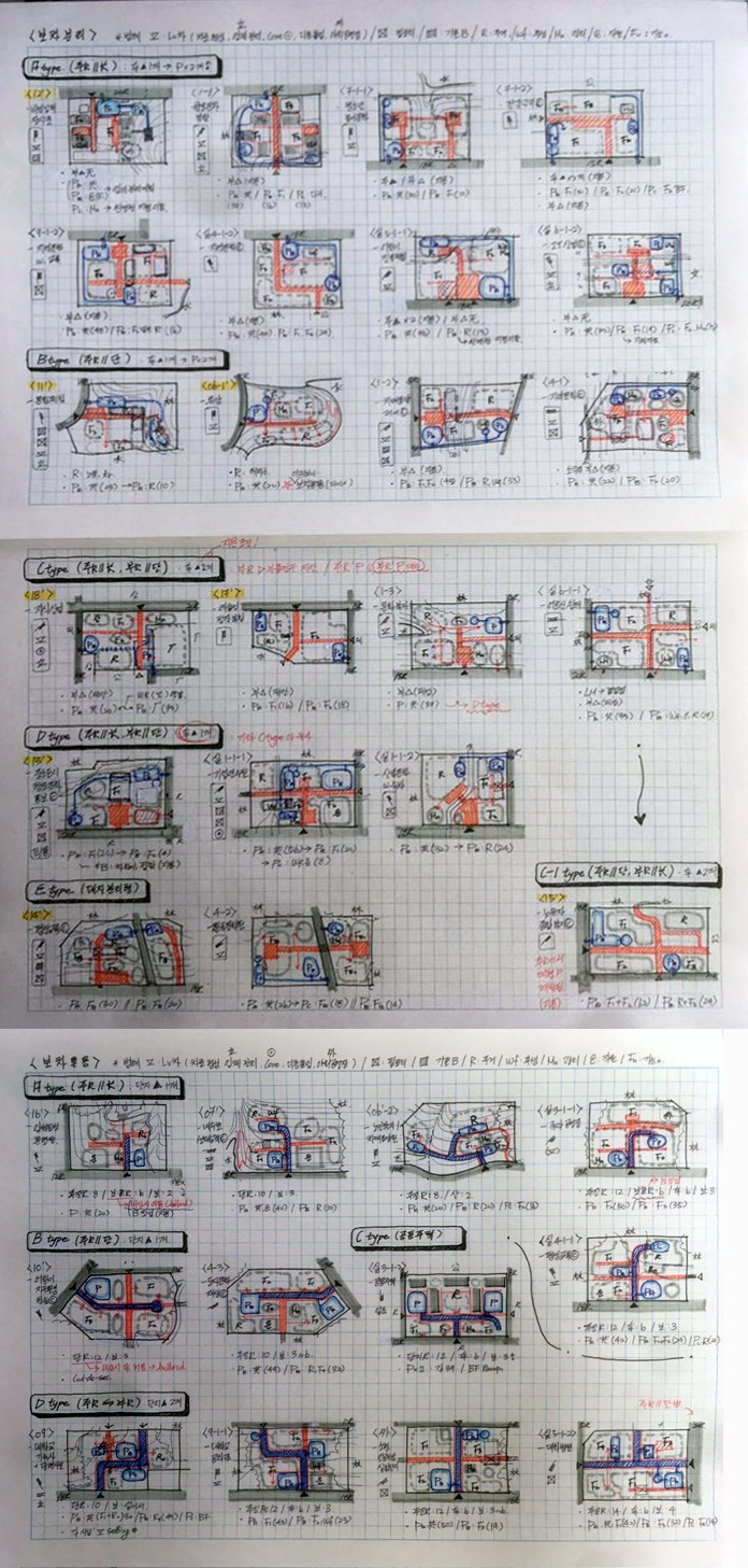 이 작업을 시작할 때 처음부터 어떤 뚜렷한 목표가 있거나 기대효과에 대한 확신을 갖고 있었던 것은 아니었다. 다만 배치계획의 프로세스를 유형 정리로 접근하면, 그 유형에 따라 답안을 도출하는 접근 방식에 대한 힌트를 얻을 수 있지 않을까 하는 기대감이 있었다. 한 마디로 출제의도를 파악하기 위한 것이다. 가령 '대지 형태와 도로 상황이 이러이러한 유형이니 이러이러한 배치 유형이 나올 수 있겠군.'과 같은 일련의 판단 과정에 있어 정리 작업이 도움을 줄 수 있을 것 같았다. 또 반대로 답안 자체를 익힘으로써, 배치계획에 대한 경험이 전무한 내가 직접 공부한 유형들을 레퍼런스로 능숙하게 활용하기를 바랐다. 실제로 그 뒤로 풀었던 학원 문제들을 보면 확실히 효과가 있었다. 텅 빈 답안지에 마치 희미하게 전체 그림이 보여지는 듯한 착각이 들 정도였는데, 학원 문제들이 내가 정리했던 유형에서 크게 벗어나지 않았기 때문이었다.