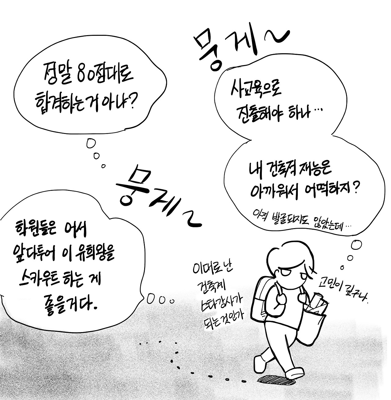 그 이후로부터 2017년 기출을 마주할 때마다 그 장충동의 족발 거리가 떠올랐다. 가판대도, 벤치도 없이 완전무결하게 사선 패턴으로 포장된 너비 8m의 보행통로. 점심 시간이면 건물에서 사람들이 이 사선으로 해치 표시가 된 보행로로 우르르 몰려 나오다가도, 여름의 복사열을 피해 어디론가로 금세 또 사라져버릴 것만 같다. 나는 가끔 창작거리 가운데에 멀뚱히 서 있는 상상을 해본다. 거리를 중심으로 양분화 된 적절히 조닝이 된 3층 캠퍼스 건물들과 마당들을 떠올렸다. 공기도 낮게 눌려 흘러갈 듯한 납작한 공간감이다. 문득 생각했다. 배치계획에서 건축가가 꼭 고민해야 하는 중요한 것들이 있다면, 이 시험은 그 중 몇 가지를 평가하고 있을까? 내가 건축사가 될 수 있을지 없을지 가늠할 정도로 그 기준들이 그렇게 중요한 것일까? 하지만 이런 의문들을 던져봤자 내 슬기로운 수험생활에 전혀 도움이 되지 않을 것이다.