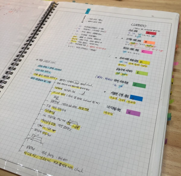 대지 과목을 공부하는데 있어 숙지해야 하는 모든 법규는 직접 필기하며 정리했다. 한 눈에 쉽게 훑어볼 요량으로 A4 크기 빈 종이 몇 장에 모두 정리했는데, 이것만 하루 종일 붙잡고 작업하니 3-4일 이내로 끝낼 수 있었던 것 같다. 정리한 내용은 오답노트에 앞면에 붙여 대중교통으로 이동하는 중에도 틈틈히 보았다. 학원에서 해마다 나눠주는 이론 및 법규 요약지는 잘 갖고 있다가 필기 정리할 때 유용하게 참고만 했다. 이전에 어느 분께서 건축기사 시험 내용을 예쁜 손글씨로 노트에 잘 정리했는데 이를 일부 스캔하여 SNS에 공유한 걸 보았다. 댓글이 많이 달려 살펴보니, 본인 메일로 그 노트 전체 스캔 이미지 파일을 전송 부탁한다는 요청이 가득했다. 남이 잘 정리한 노트는 마음에 안정을 주는 역할을 하나보다. 그러나 단지 그 뿐일 것이다. 대학교 법규 과목 이수할 때, 건축기사 공부할 때 법규를 아무리 달달 외워도 시험이 끝나면 바로 까먹게 된다. 건축법 제119조를 항목별로 눈이 빠지도록 읽어도 내가 직접 정리한 것만 못하고, 노트필기를 아무리 잘 해도 허가도면의 면적 계산표를 직접 작성하면서 고민하는 것만큼 그 학습효과가 떨어지듯 말이다. 법규 정리 작업은 꼭 시험 전에 한 번쯤 직접 정리해 볼 것을 권한다. 심지어 미루고 미루다 시험이 바로 코 앞까지 다가왔다고 하더라도 말이다.